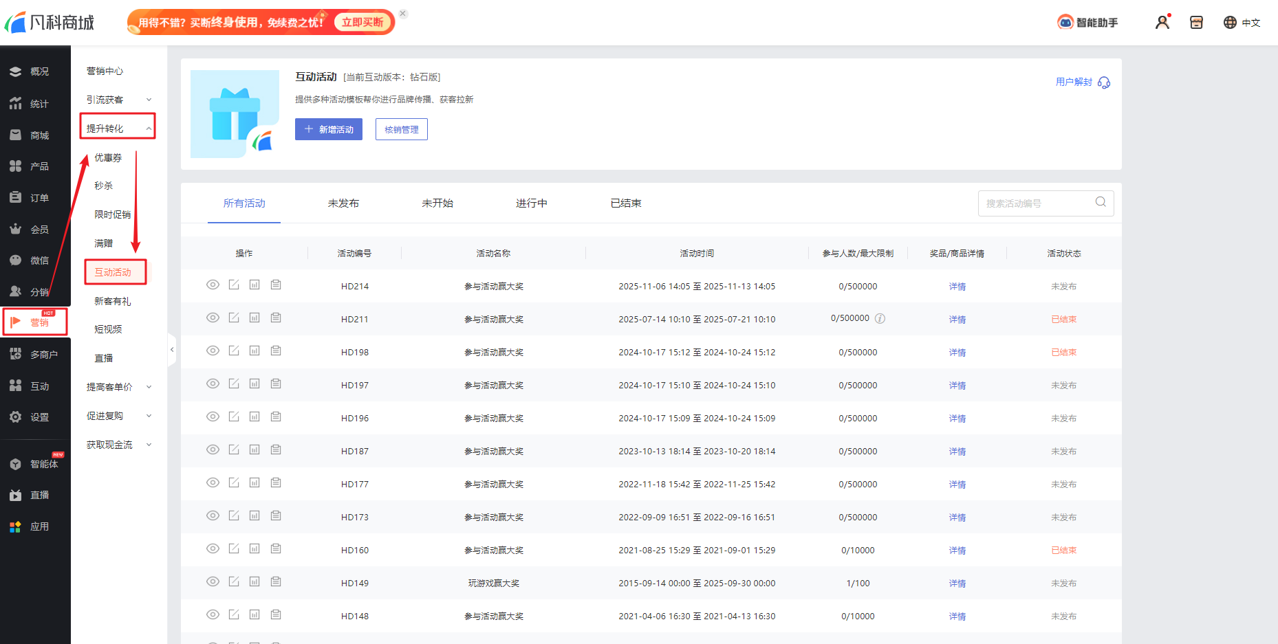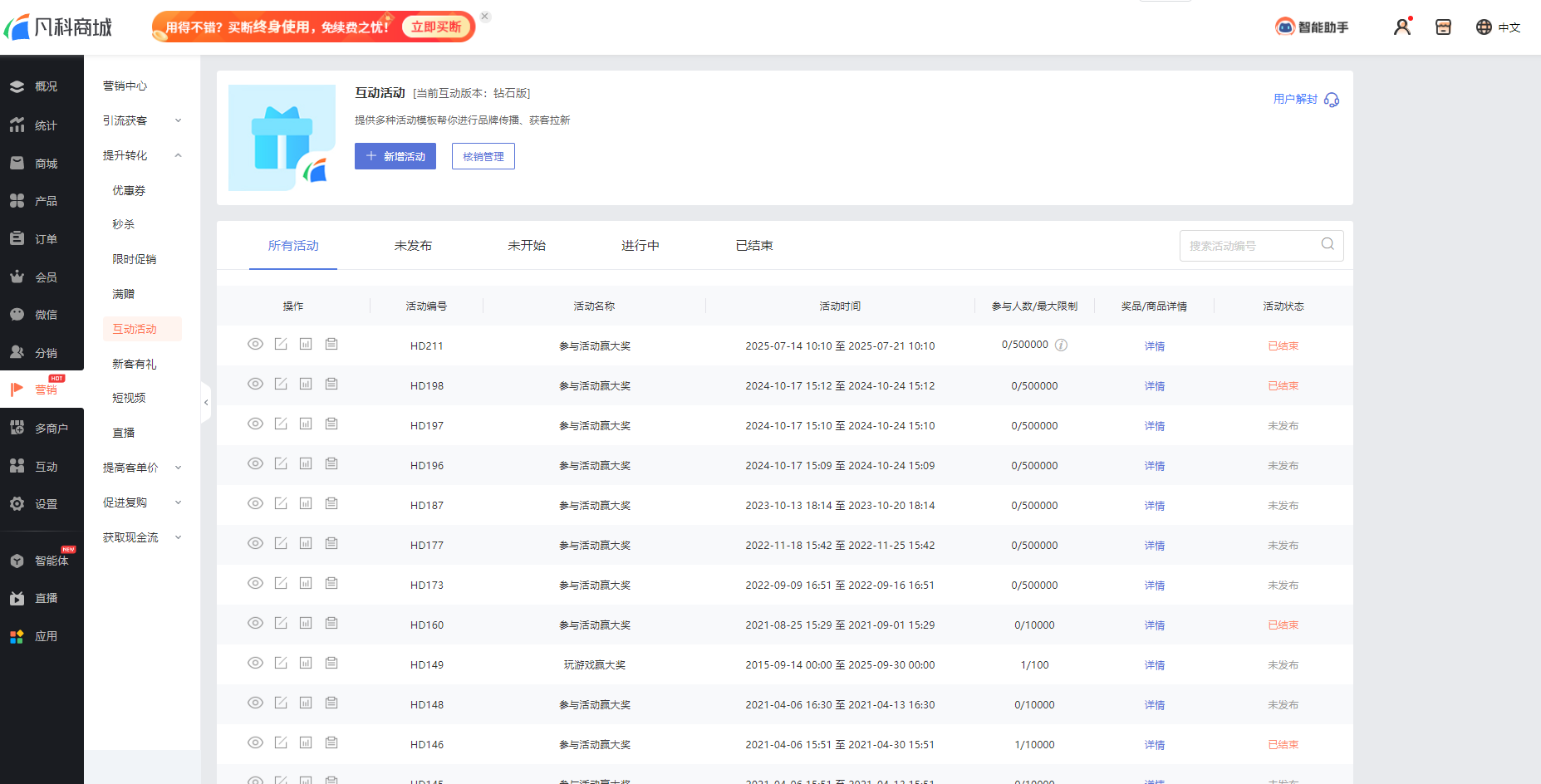 打通商城和互动(营销活动)的数据,支持商家在商城管理互动活动,轻松完成活动创建、编辑、预览、查看统计数据、查看获奖名单等操作;