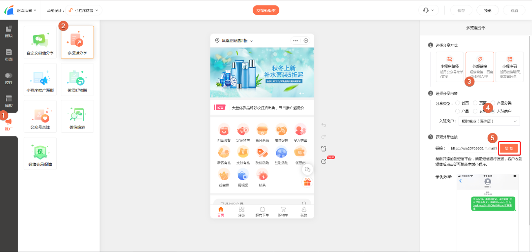 获取外部链接后,商家可将链接投放至微信生态外渠道,进行短信营销、百度/头条等APP推广。