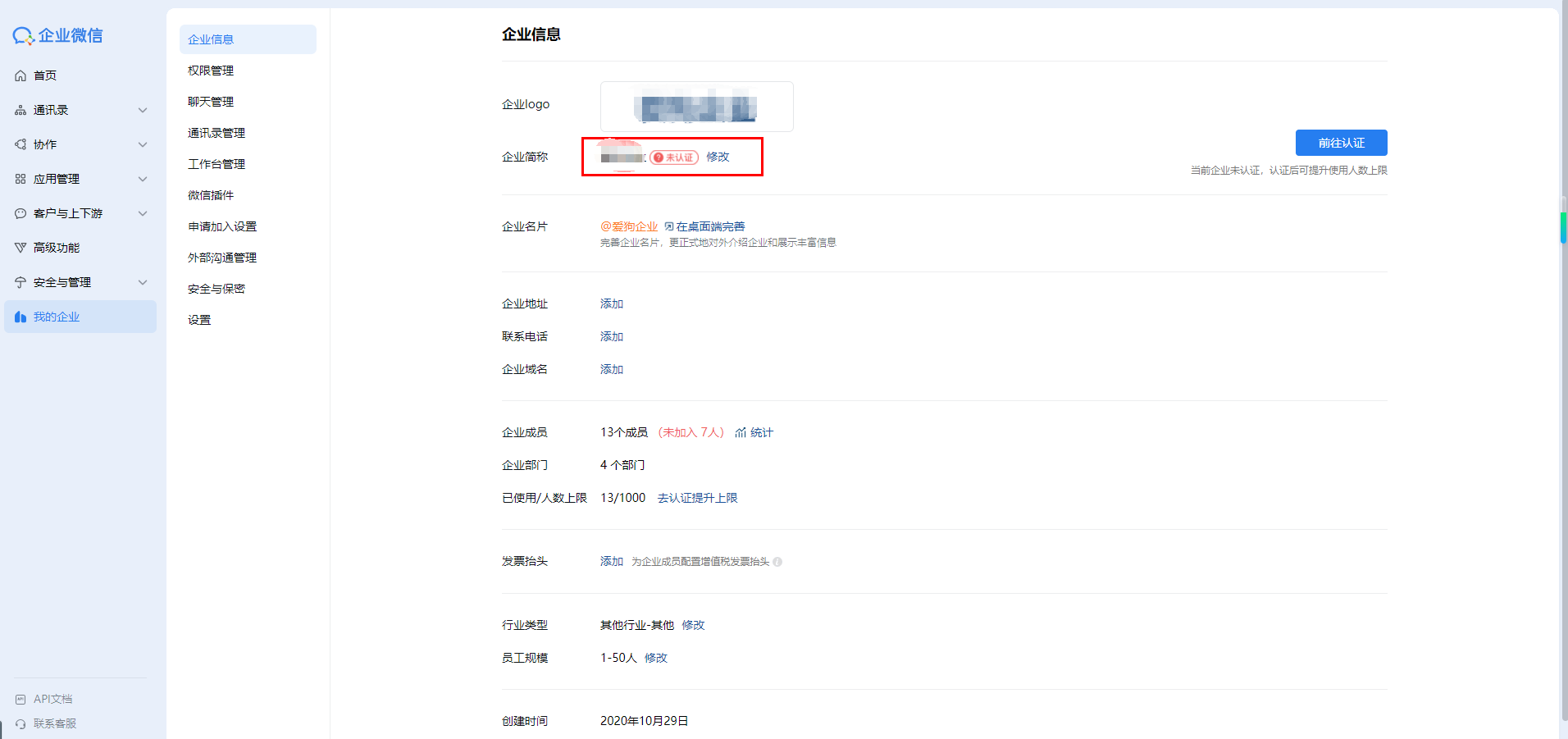 ① 微信小程序主体必须和企业微信的【企业全称】一致;仅支持非个人主体小程序