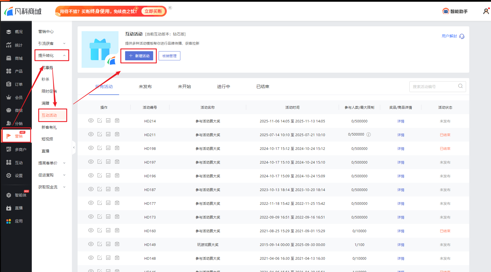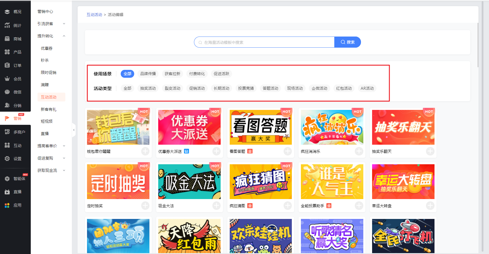 ① 在【营销-提升转化-互动活动】中点击新增活动,即可进入活动新增页面,可通过使用场景和活动类型进行筛选适合的活动模板。