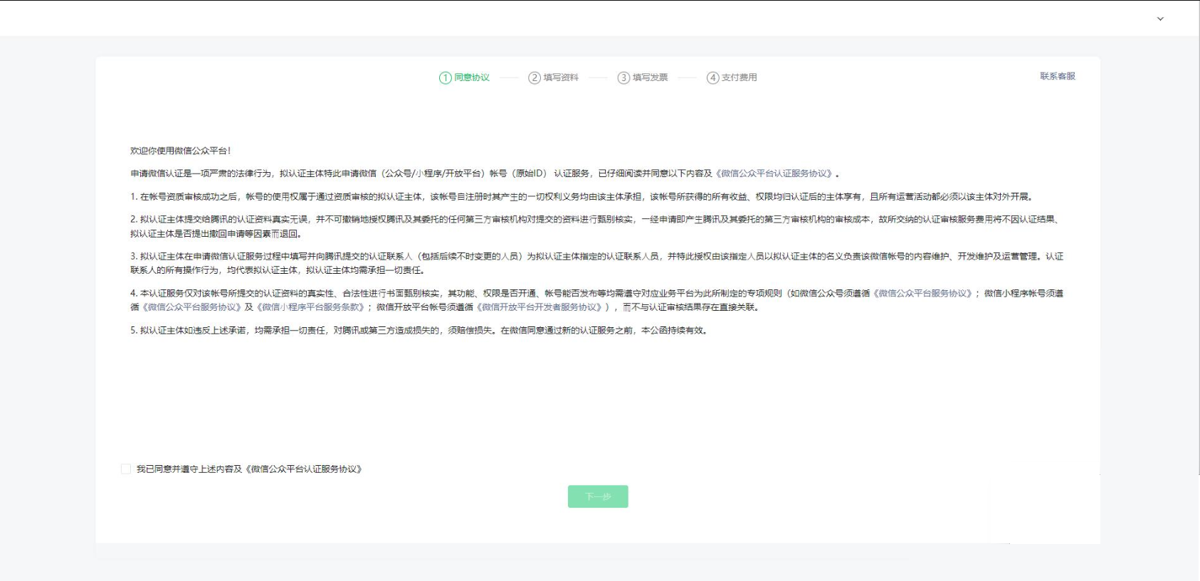 签署《微信公众平台认证服务协议》,勾选同意,点击下一步。
