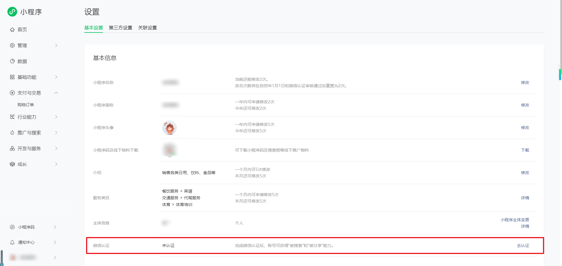 入口一:登录到微信公众平台(mp.weixin.qq.com)-小程序管理后台--基本设置操作。