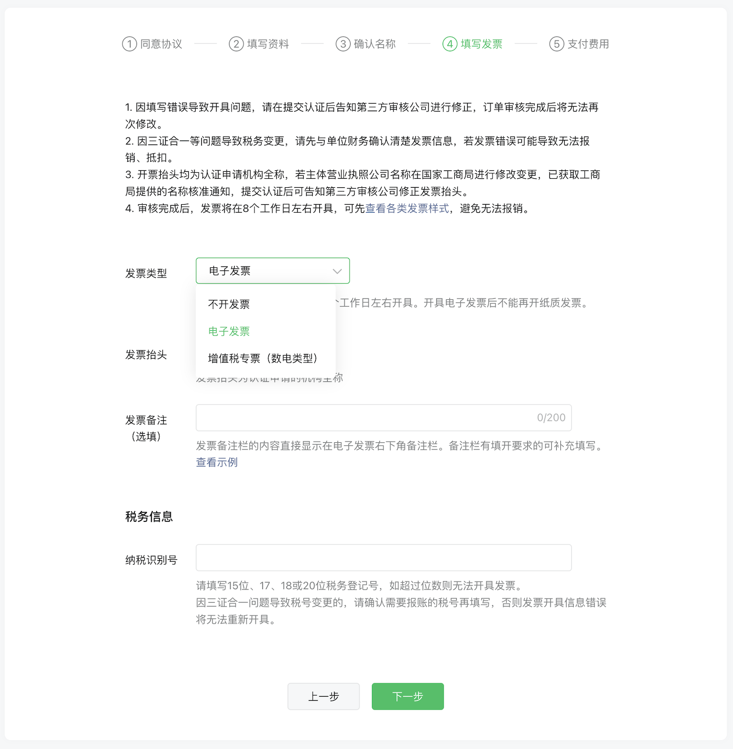 选择完类型后进入填写认证资料页面,各类型需要提交的资质材料包括但不限于: