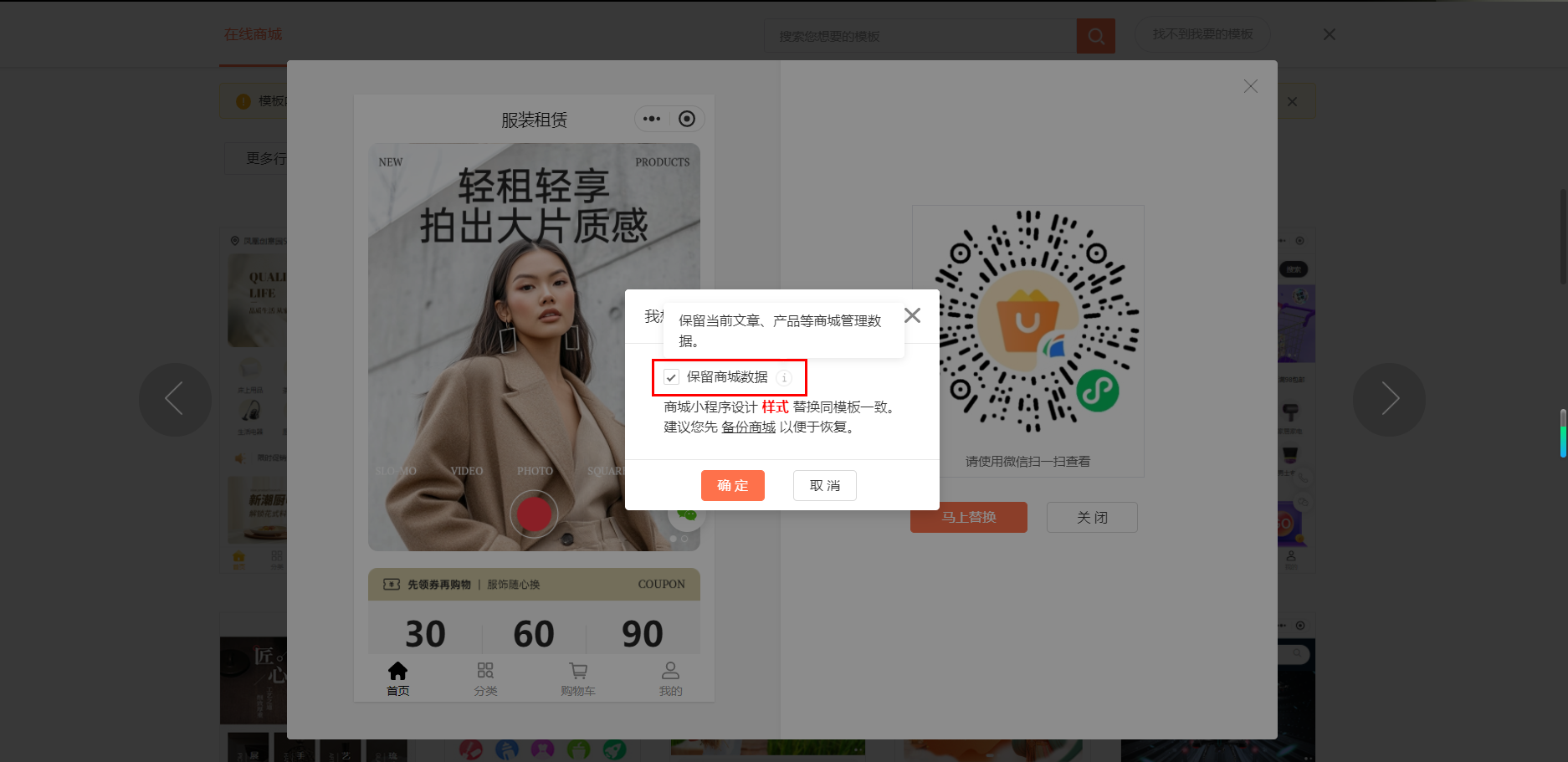 注:更换模板是会被新模板的设计覆盖的哦,您可以先手动备份,如有需要可以还原部分数据的呢