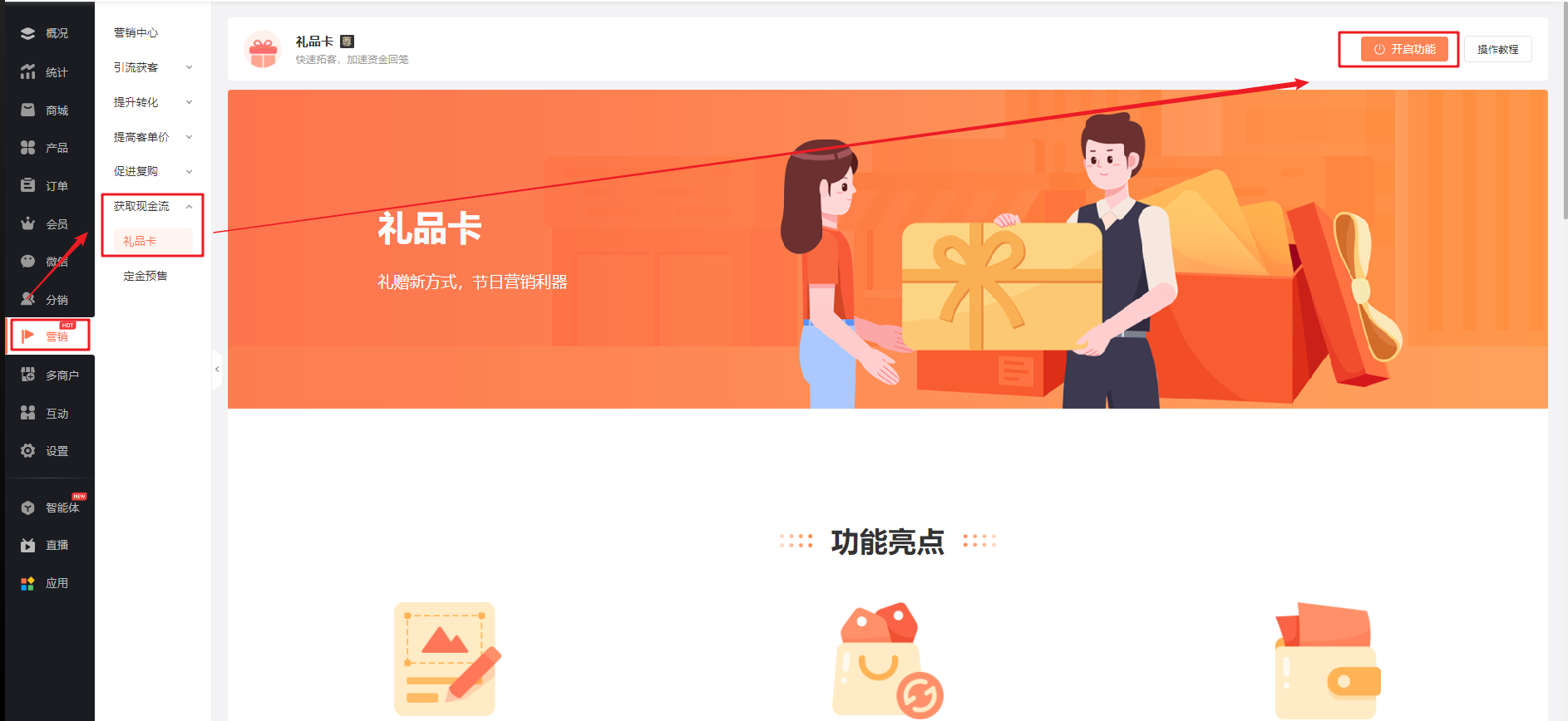 在商城管理后台【营销-获取现金流-礼品卡】中开启功能