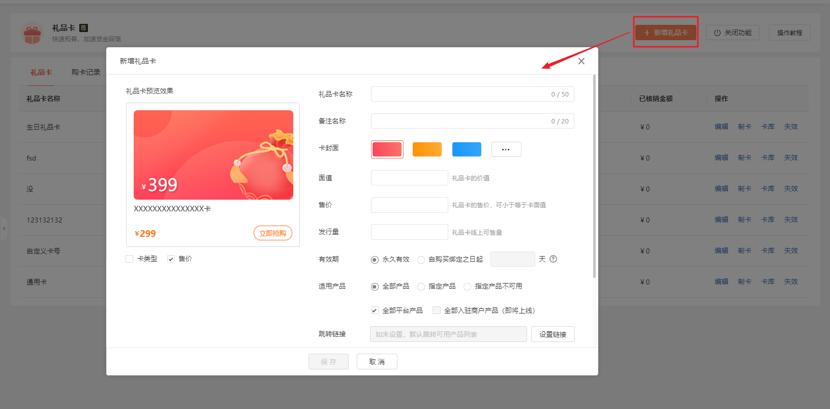 点击【新增礼品卡】以创建礼品卡活动: