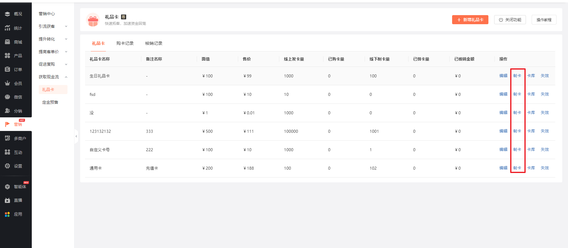 如需线下发卡给会员,可以进行制卡。对指定礼品卡点击【制卡】即可开始制卡: