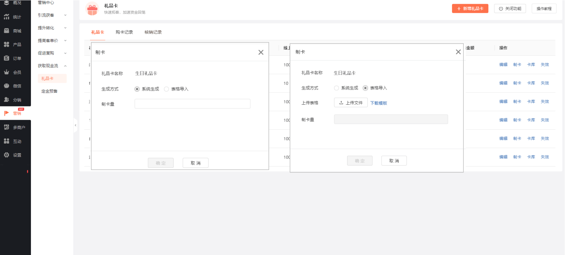 ① 系统生成:由系统自动生成卡号、卡密,最多可生成5000条。生成后商家可获取卡号、卡密在线下提供给会员进行绑定。