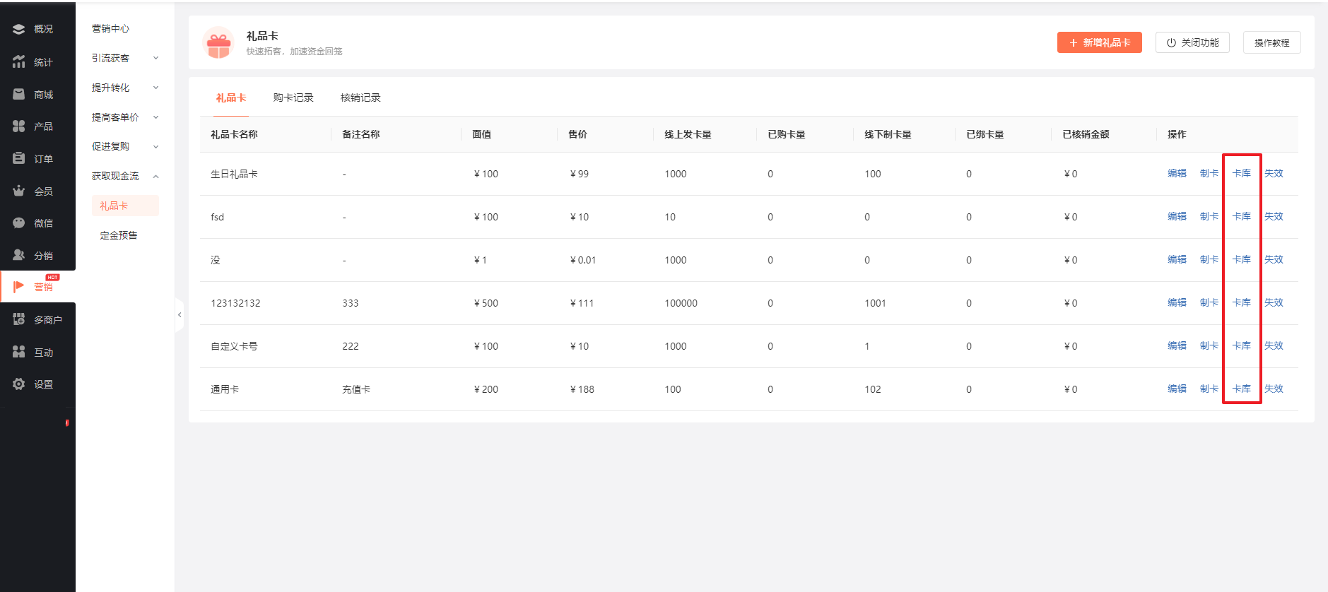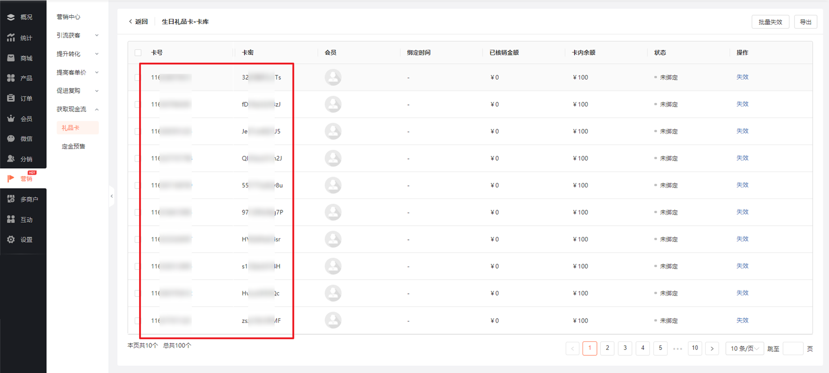 完成制卡后,点击【卡库】可查看制卡情况,能快捷查询卡的绑定、使用情况,支持指定礼品卡进行失效。