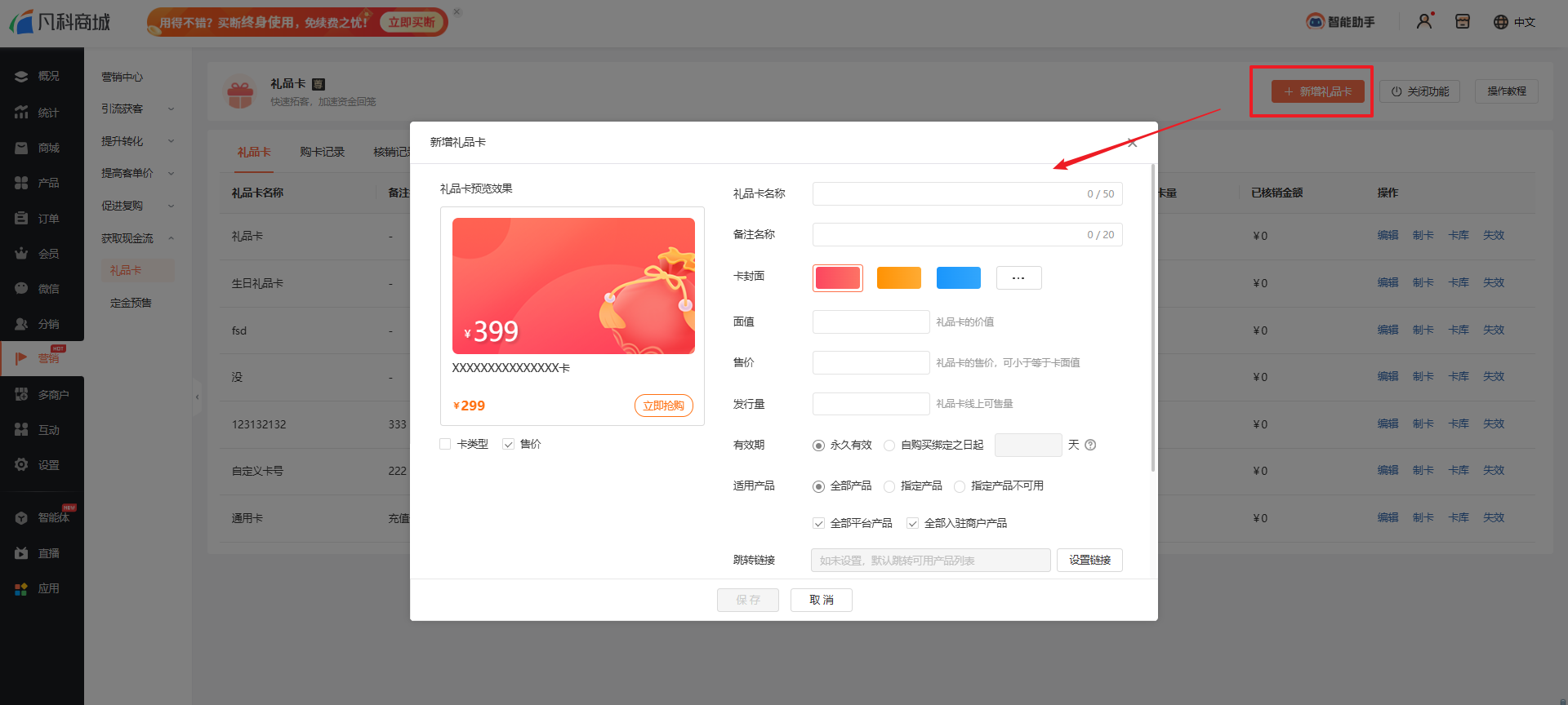售价:输入礼品卡售价,可小于或等于卡面值,为会员购买礼品卡时需支付的金额