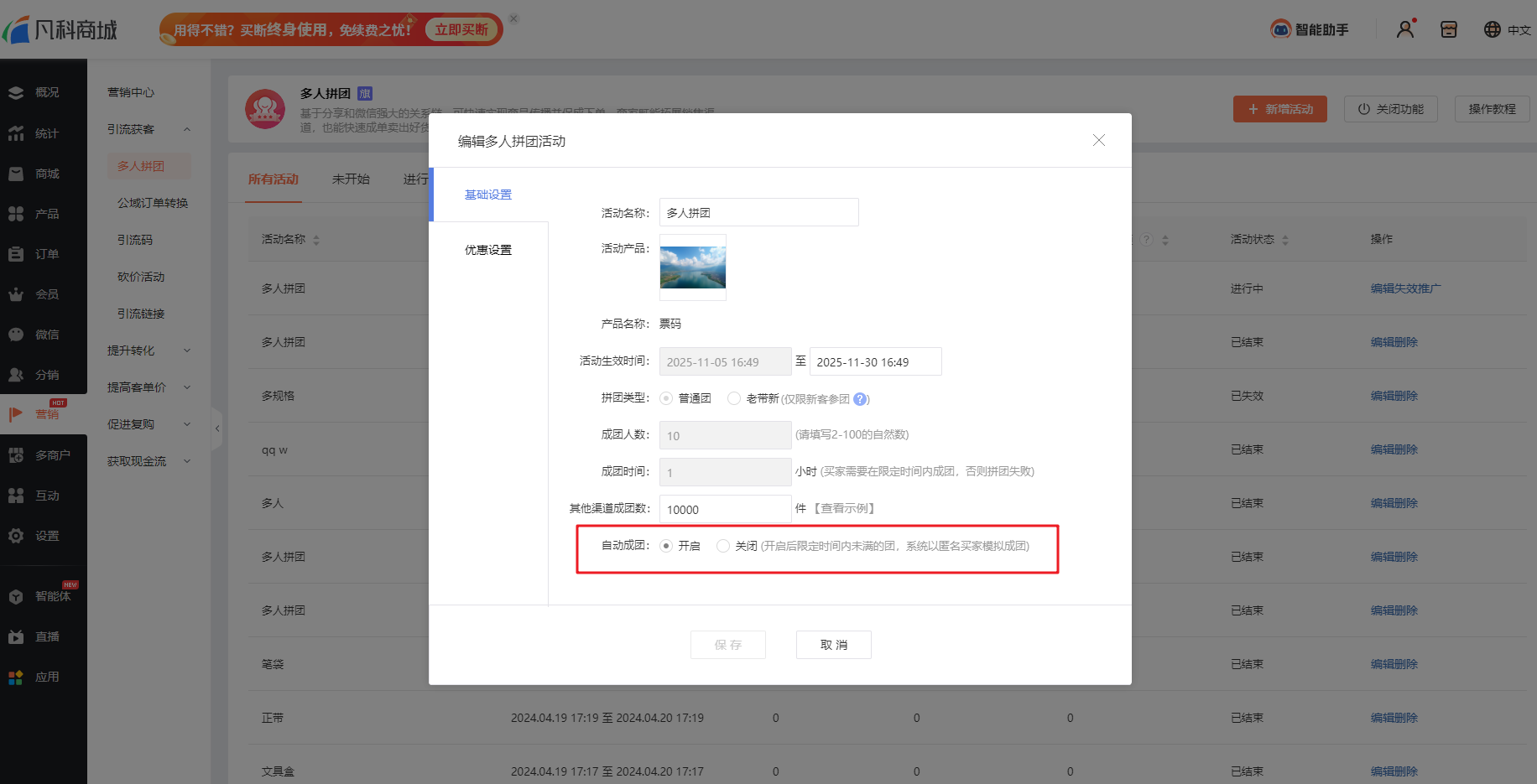 会自动成团的,自动成团是在拼团时间结束的时候去判断是否开启设置的,不会根据用户下单时间判断。