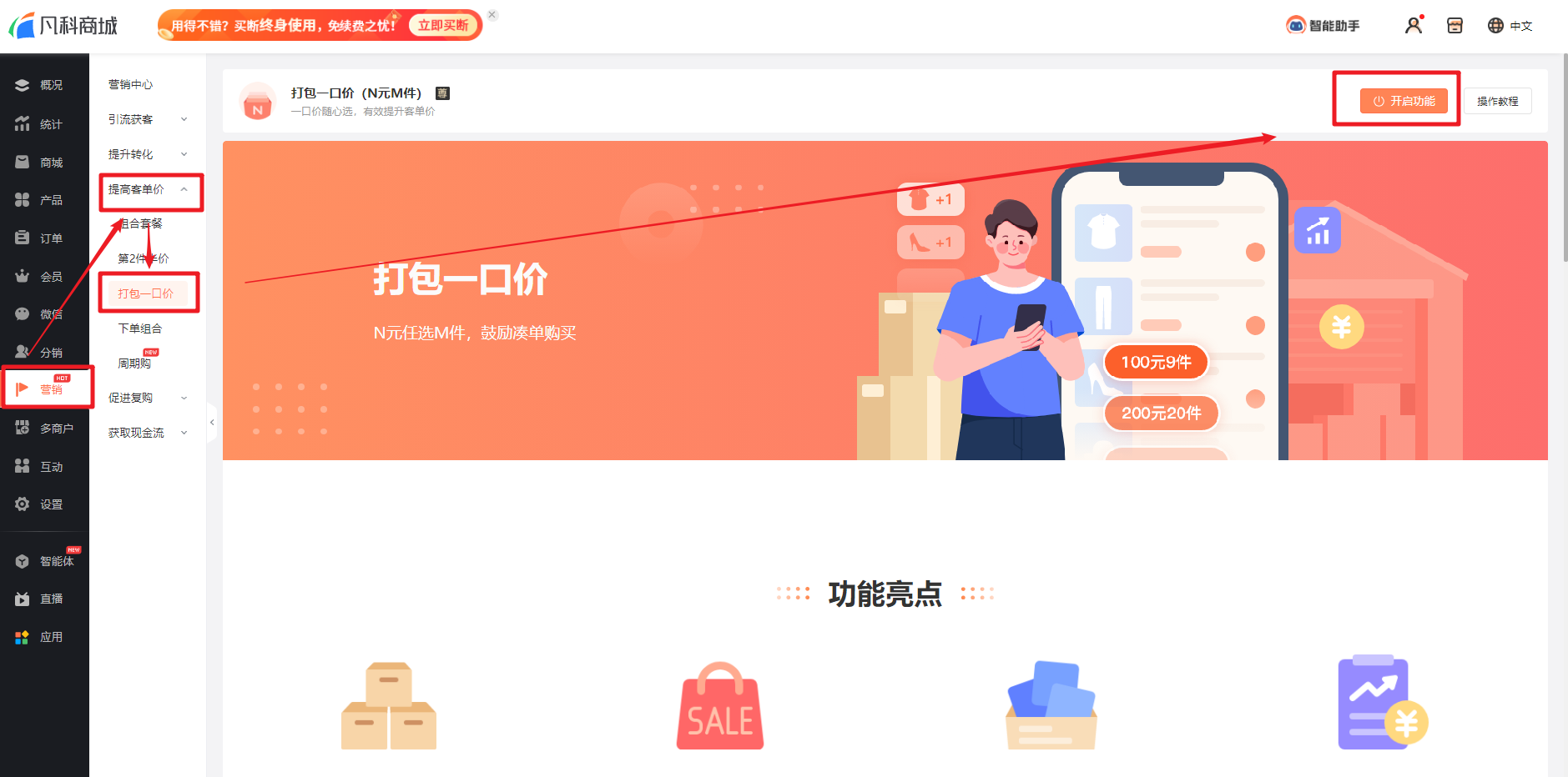 在商城管理后台【营销-提高客单价-打包一口价】 中开启功能。