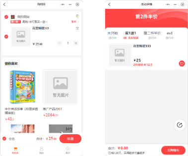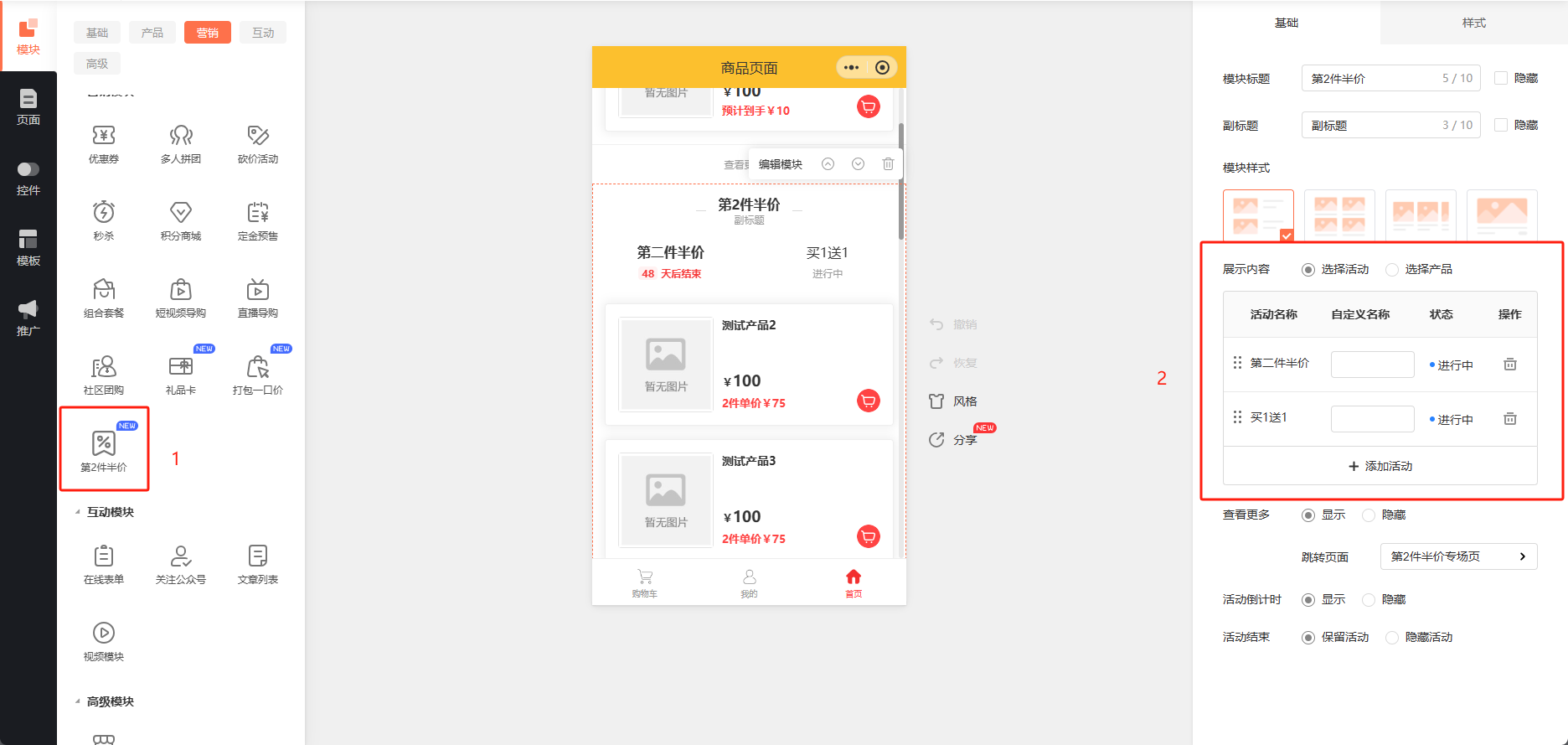 商家可商城设计器添加第2件半价模块,选择活动货活动产品展示。