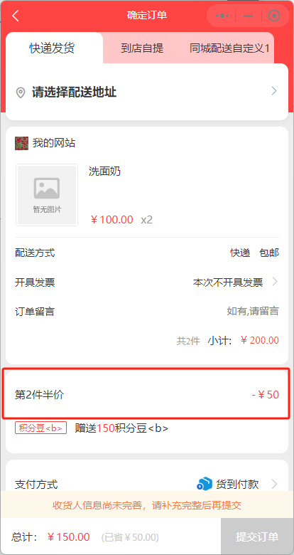 ● 第2件半价:买家下单2件产品时,第二件仅需半价