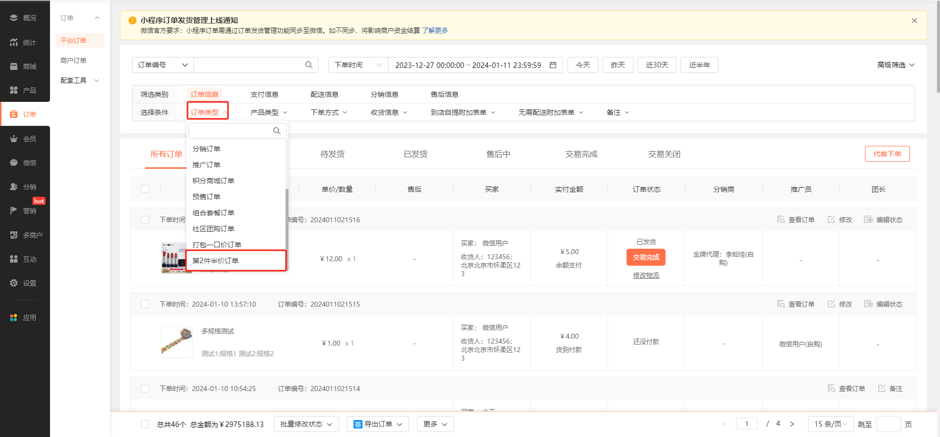 用户参加第2件半价活动后,商家可在商城管理后台【订单-平台订单】中,进行订单筛选,查看相关订单
