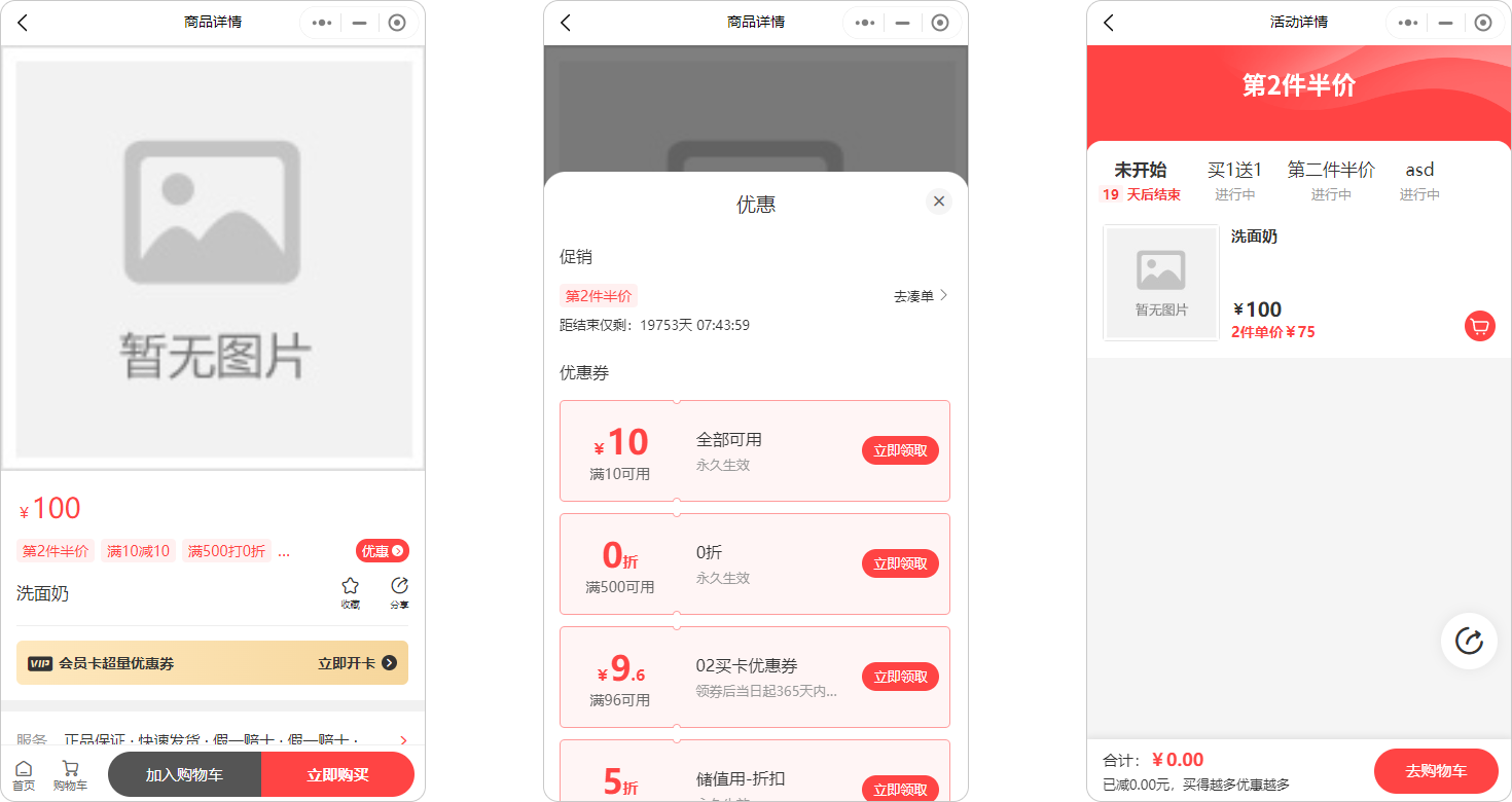 活动类型:支持“第2件半价”、“买1送1”、“买X免1”、“自定义优惠”