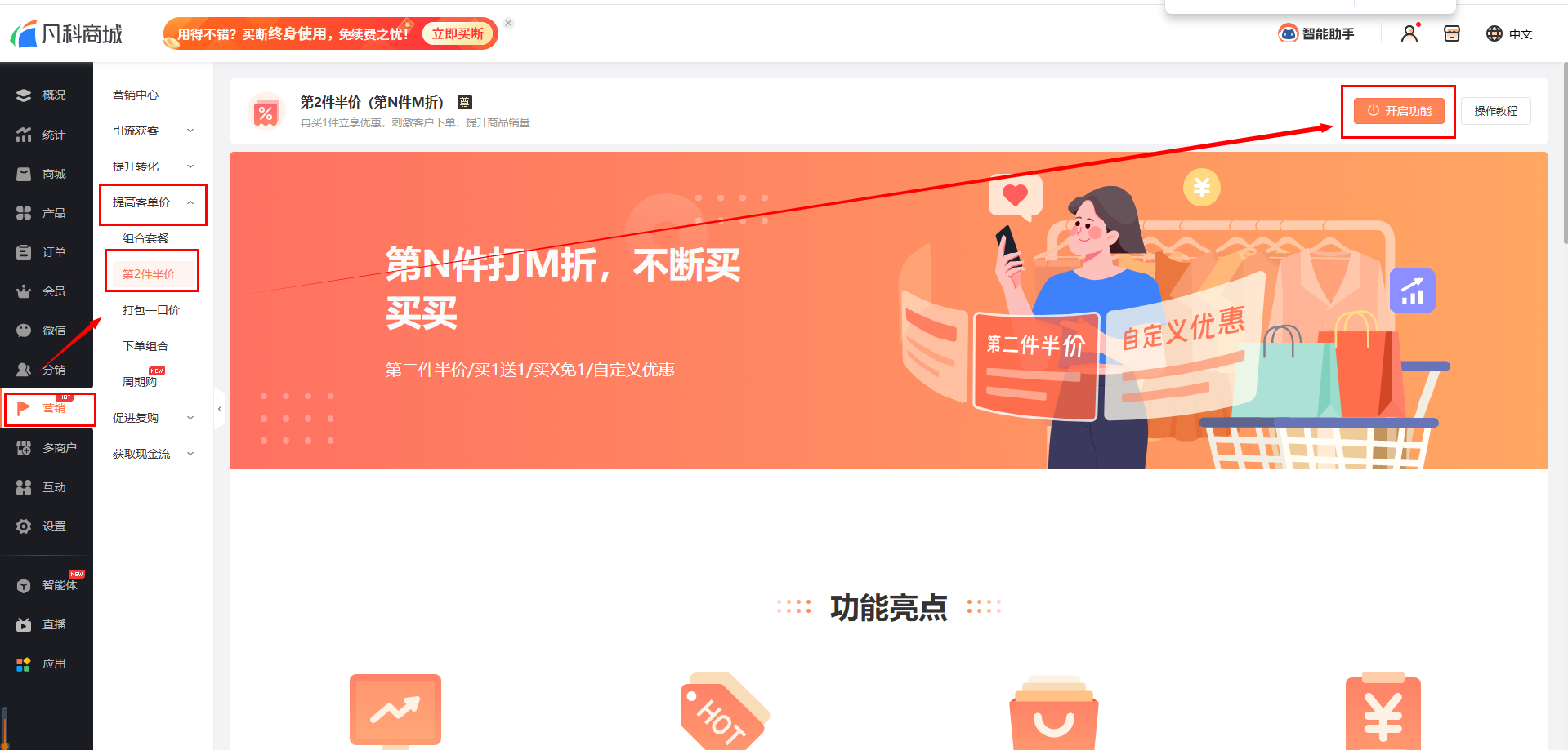 在商城管理后台【营销-提高客单价-第2件半价】 中开启功能