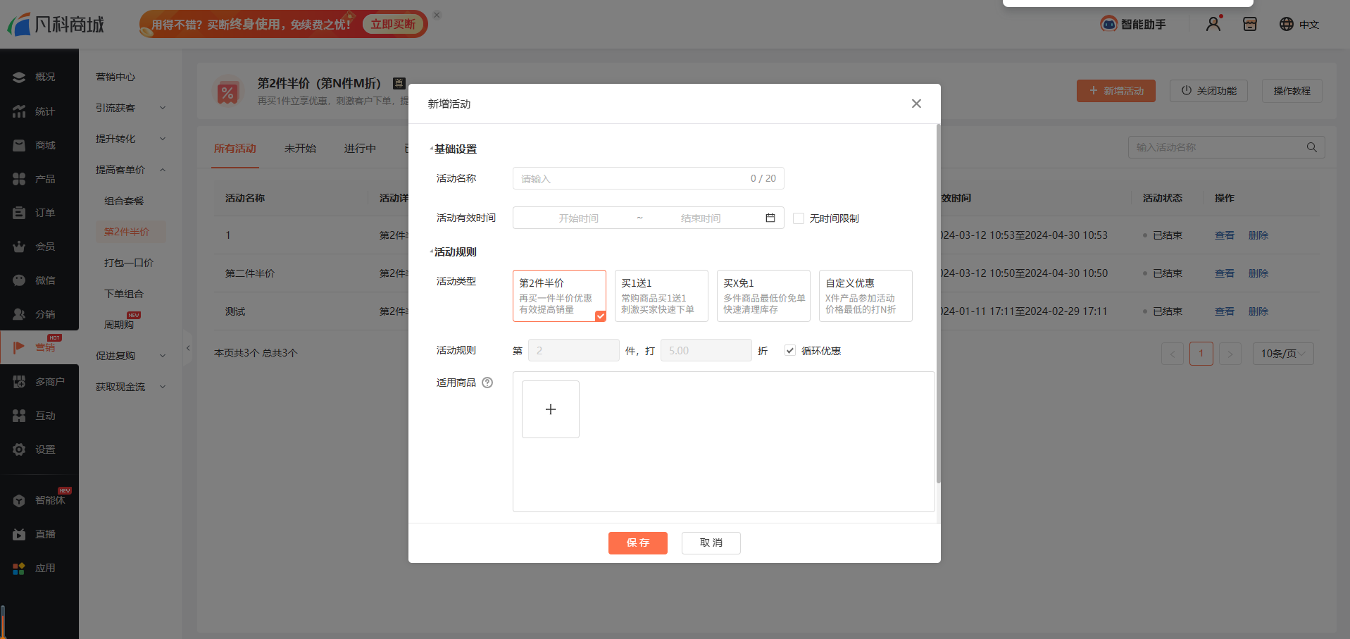 点击【新增活动】创建第2件半价活动: