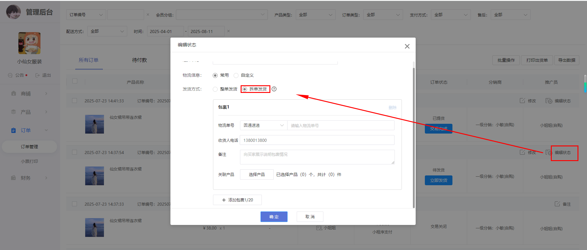 子商户后台-订单:支持拆单发货,拆单流程同商城后台;
