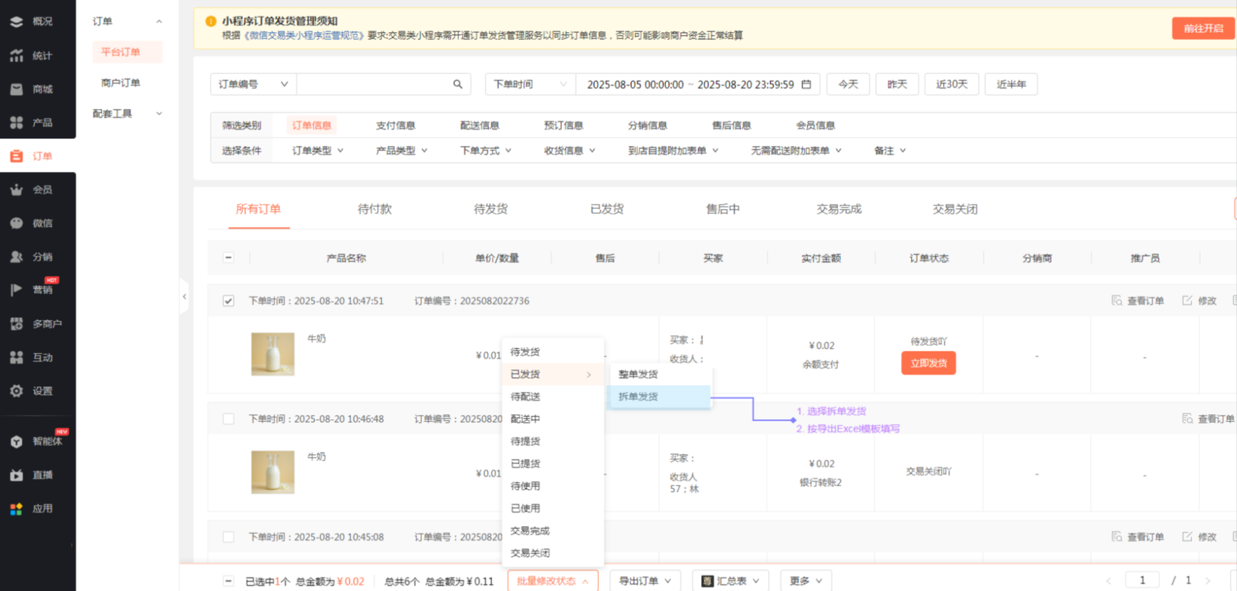 批量设置【已发货】后,可选整单发货或拆单发货,按照导出的excel模板填写即可