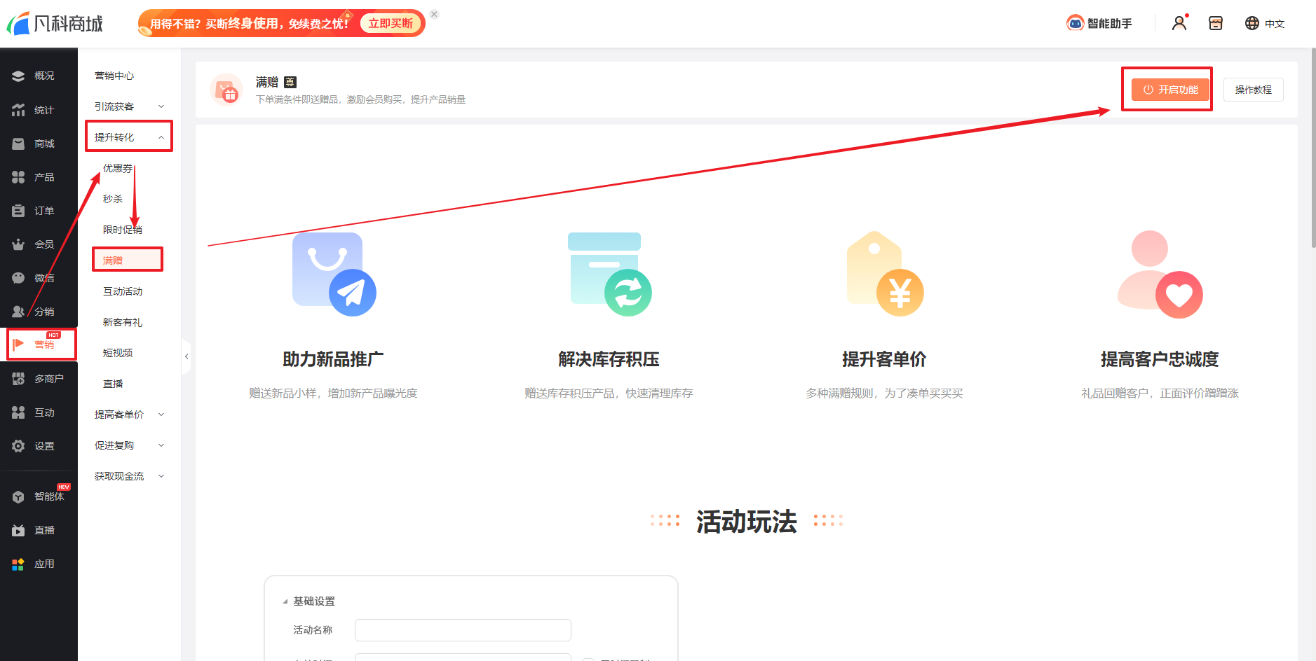 在商城管理后台【营销-提升转化-满赠】 中开启功能