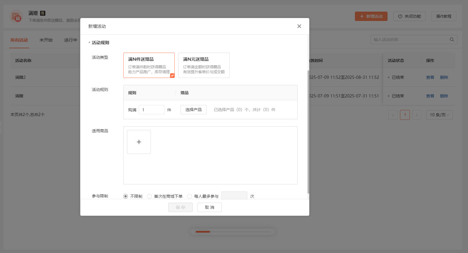 ① 活动类型:支持满N件送赠品、满N元送赠品两种活动类型