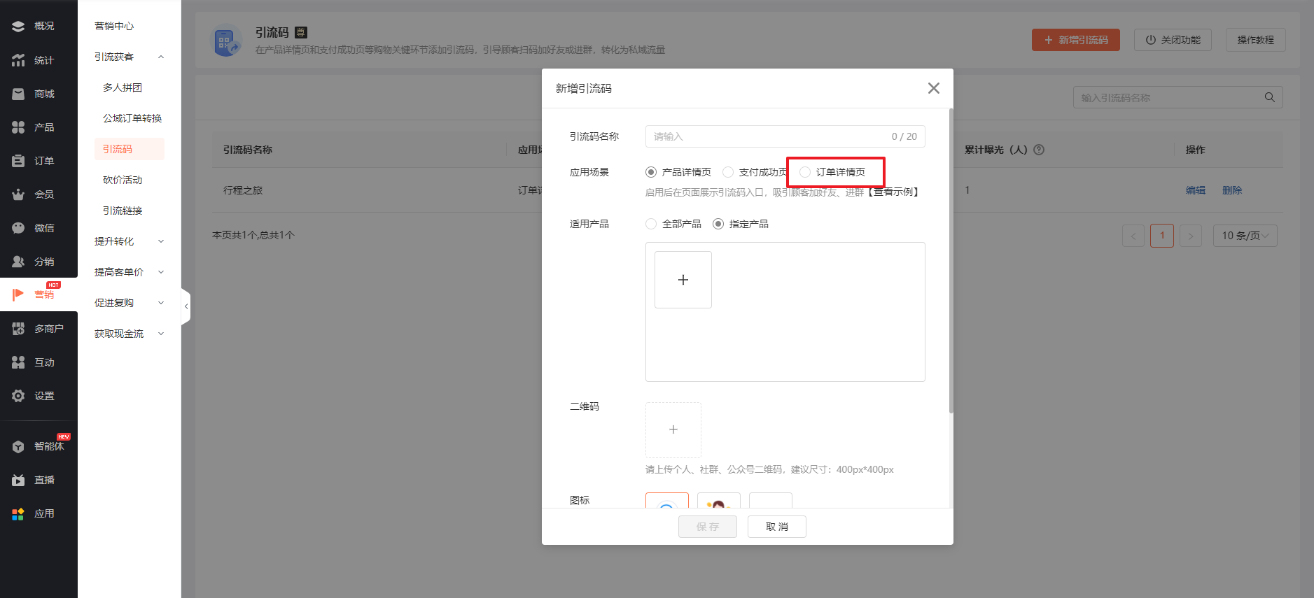 ② 创建【引流码】,选择【应用场景-订单详情页】