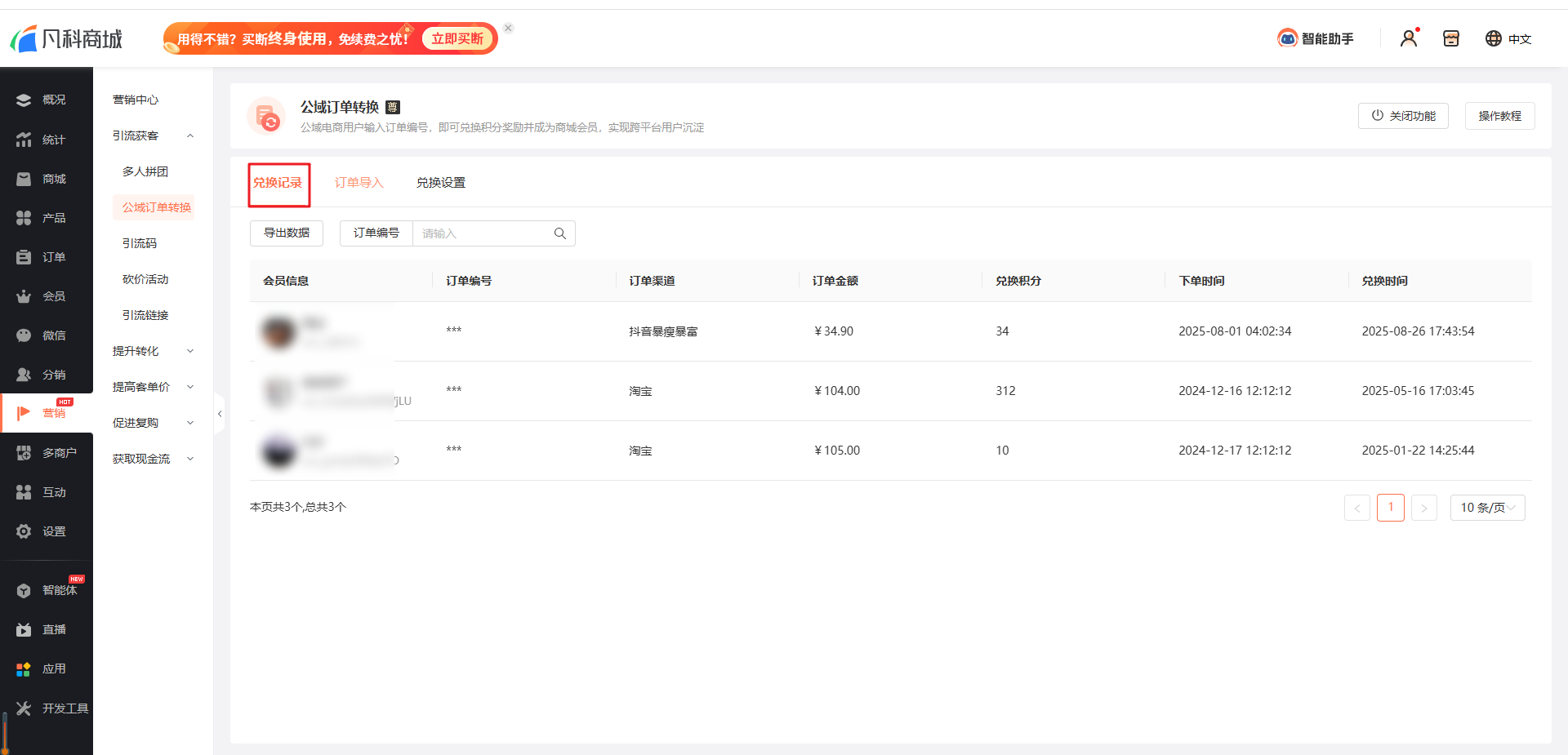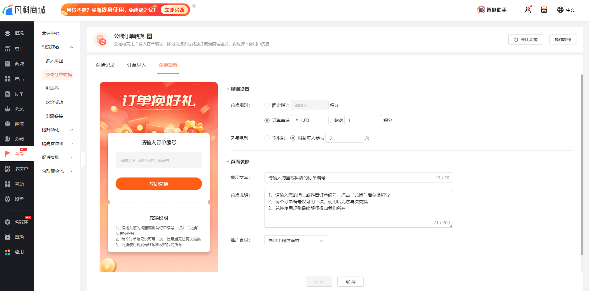 支持用户输入公域店铺(如淘宝、京东、抖店、视频号小店)的订单编号兑换商城积分,同时沉淀为商城会员。