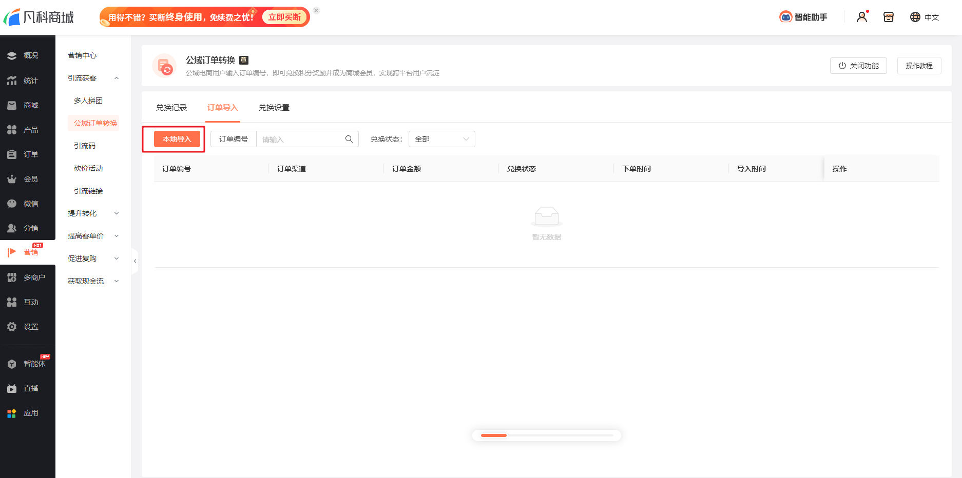 3. 前往【订单导入】,从本地导入公域店铺订单