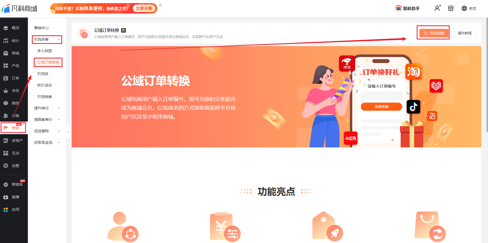 1. 前往商家后台【营销-引流获客-公域订单转换】,开启【公域订单转换】功能