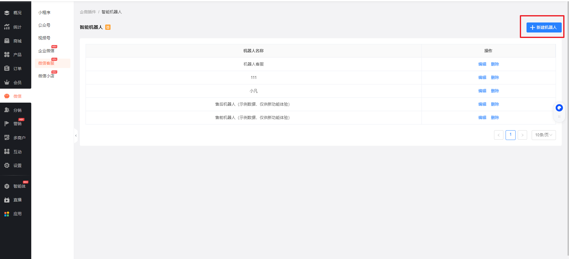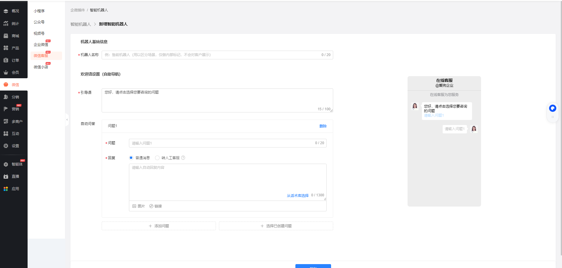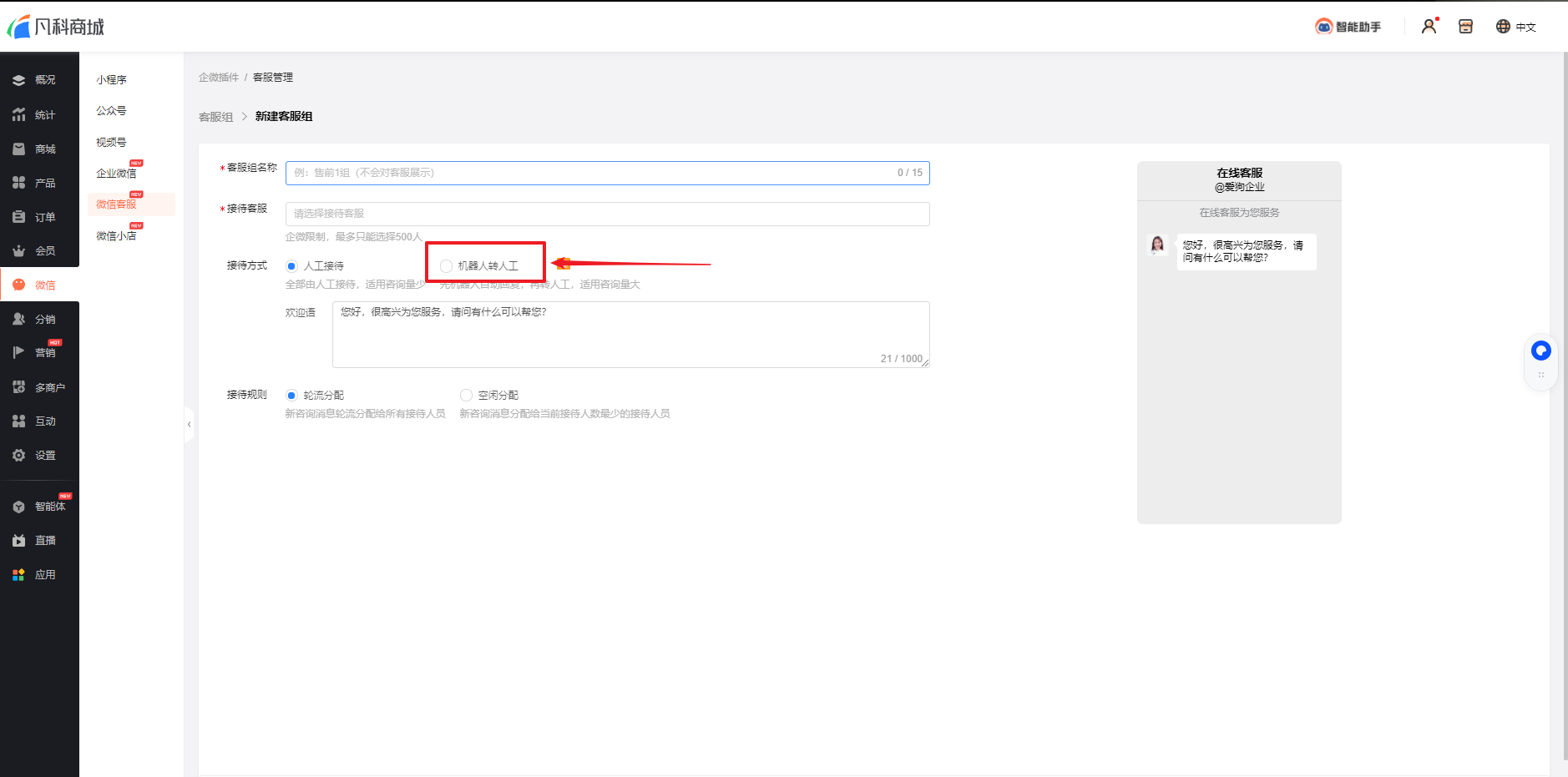 前往商城后台【微信-微信客服-智能机器】,新增机器人,设置机器人自动回答规则: