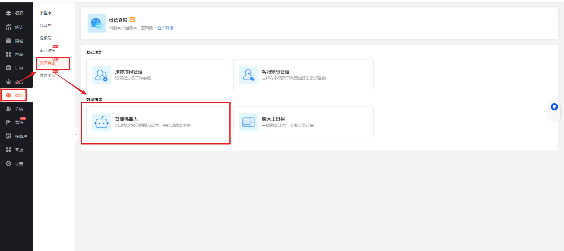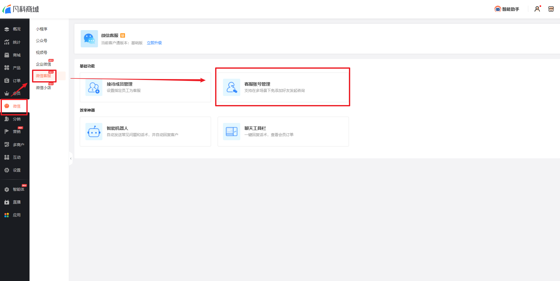 前往商城后台【微信客服-客服管理--客户账号管理】,指定客服设置生效机器人