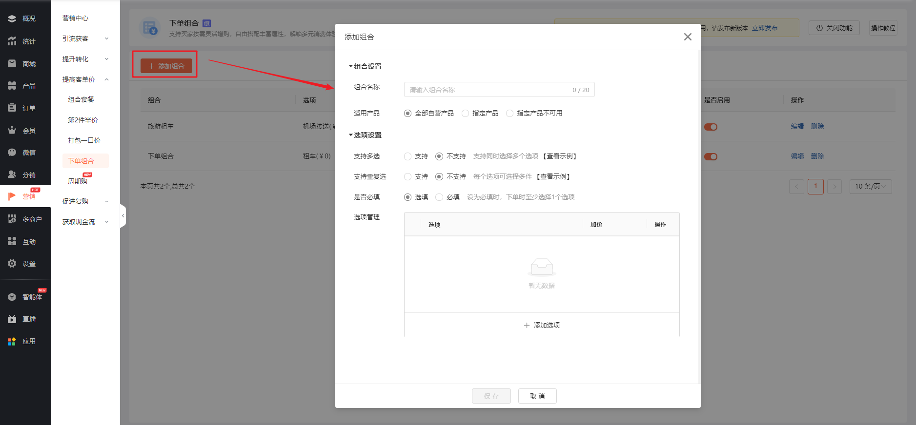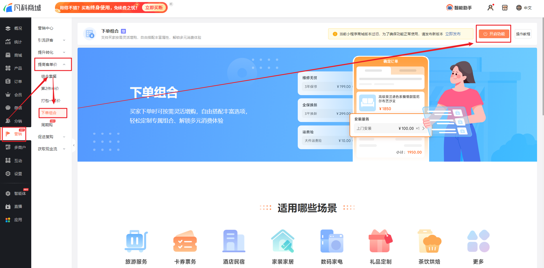 前往商城后台【营销-提高客单价-下单组合】,开启功能