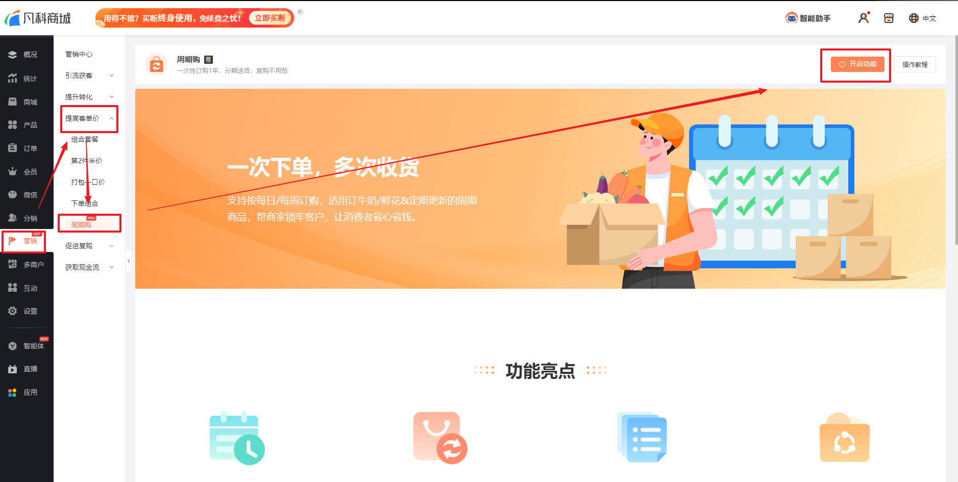 1. 前往商城后台【营销-提高客单价-周期购】,开启功能后添加活动: