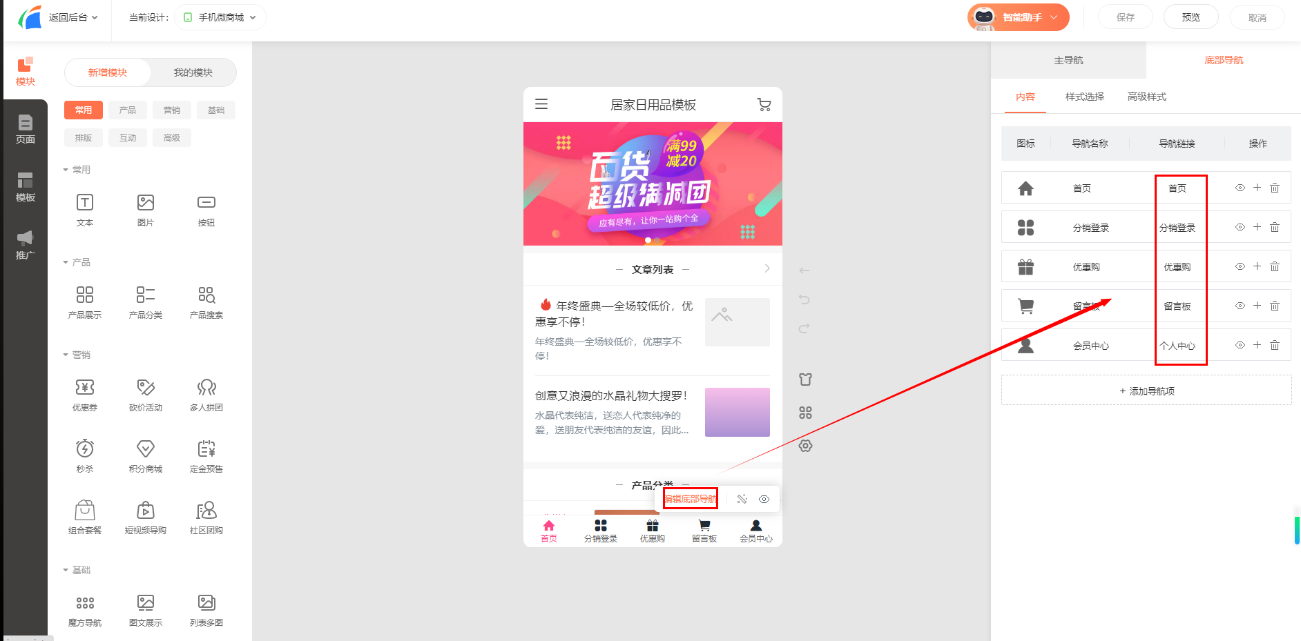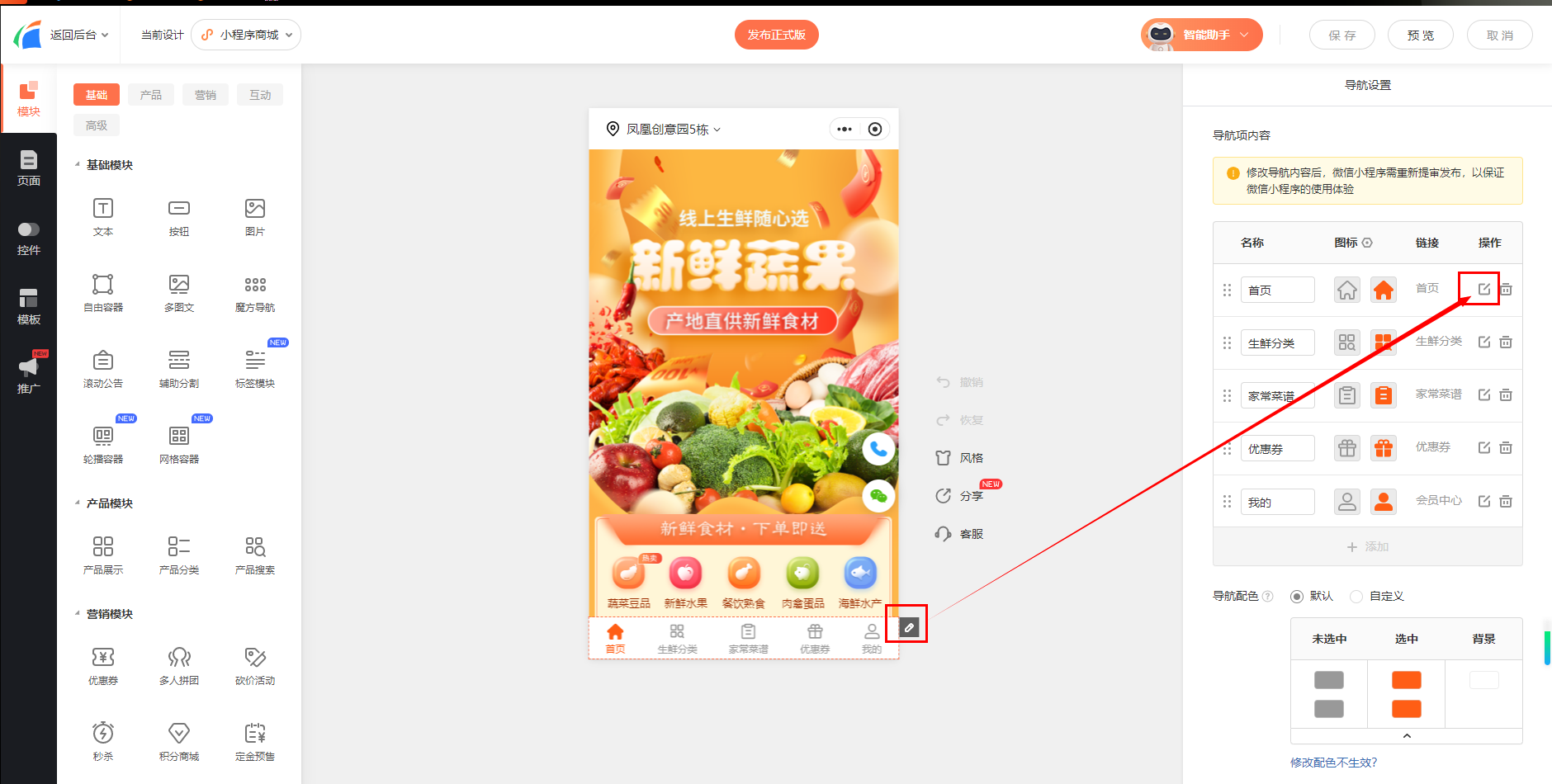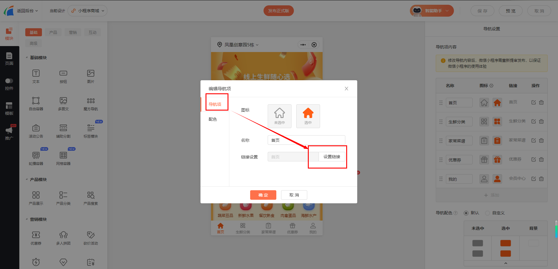 小程序:添加页面后,可新增/修改导航栏项的跳转链接到新增页面,新增后需点击【发布】按钮,重新发布才能将栏目更改同步至客户端。