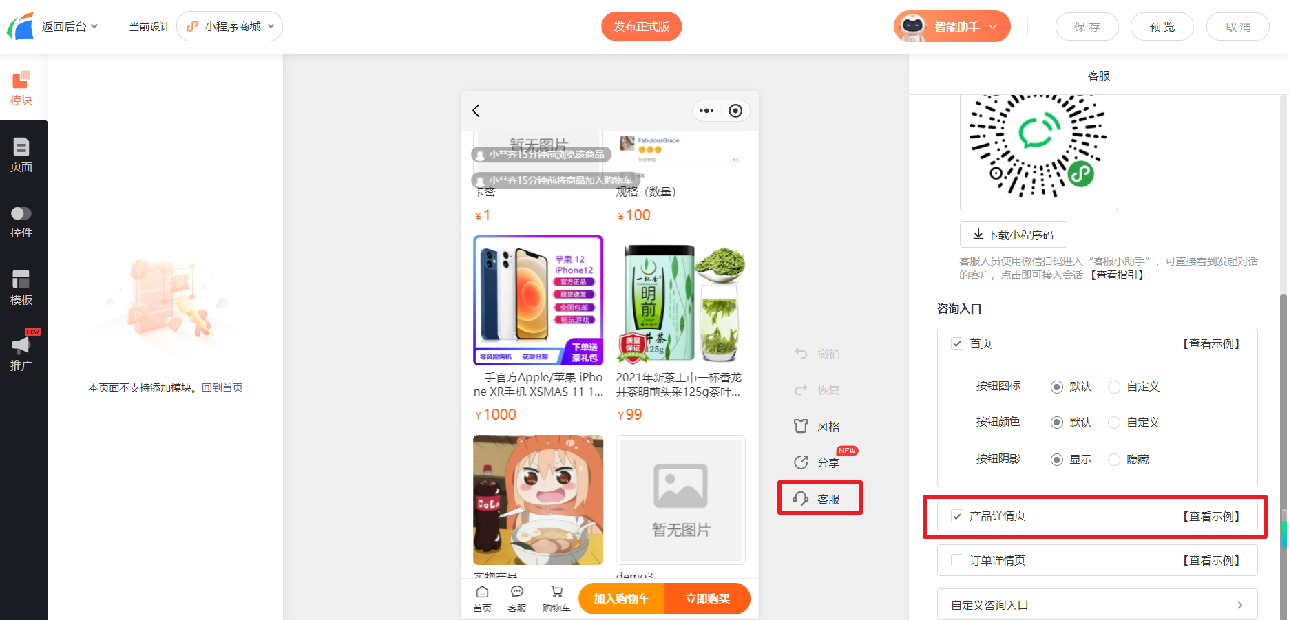 3.小程序:请按此教程完成设置 (点击查看详情),完成后勾选客服场景即可在产品详情中显示