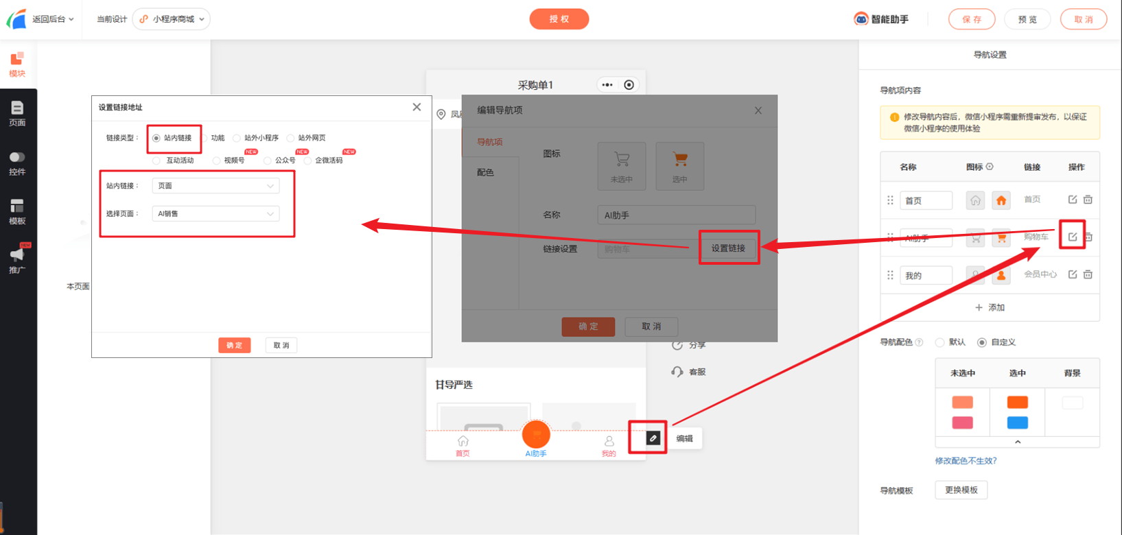 进入商城小程序编辑页面,找到【超链接控件】(如导航栏、按钮等,以下演示以导航栏为例)