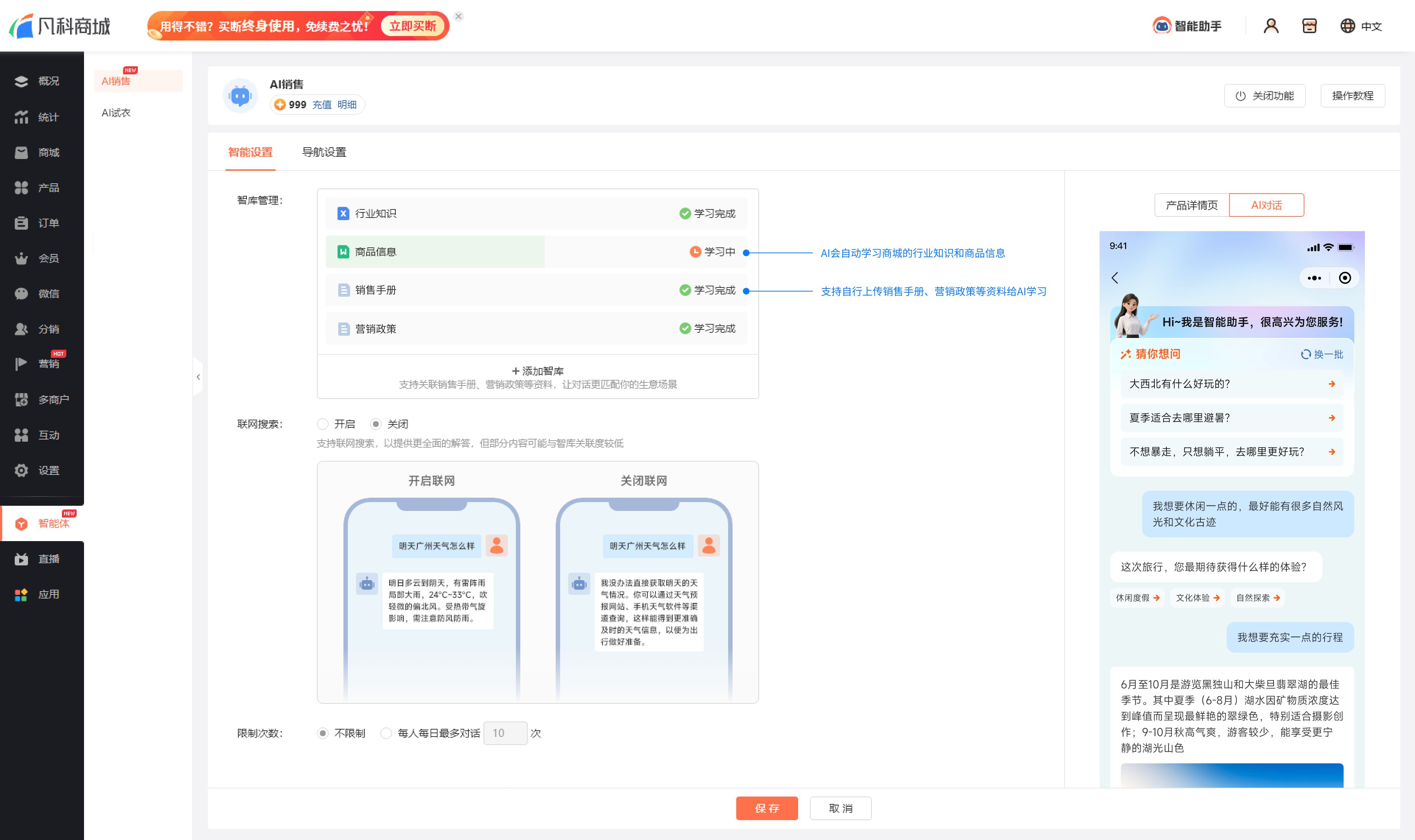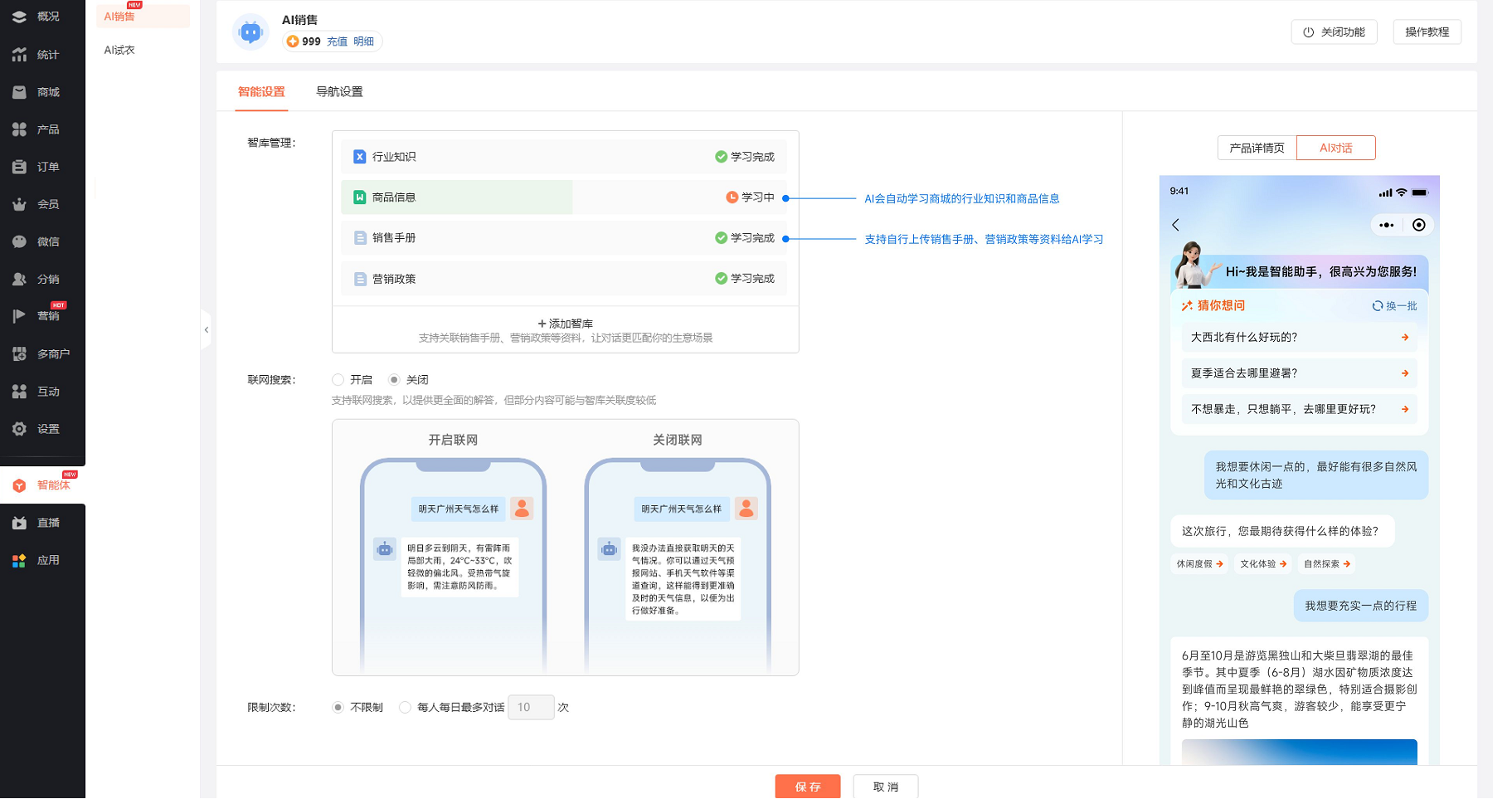 前往商城后台【智能体-AI销售】中开启功能。开启后,AI会自动学习商城的行业知识和商品信息: