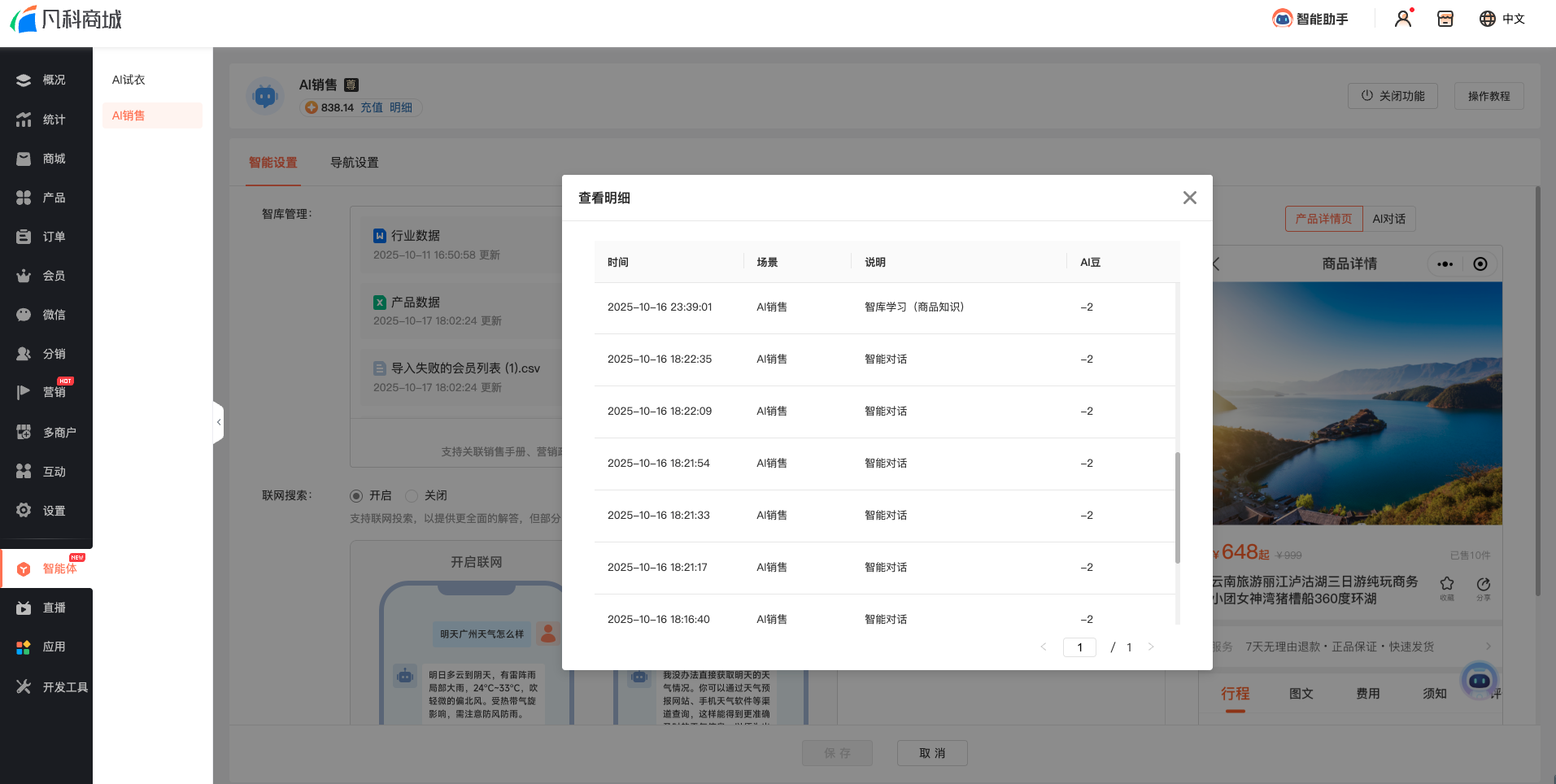 2.智库学习消耗:通过「智库学习」功能(包括系统自动学习产品数据、手动添加自定义智库内容)均会消耗AI豆,具体消耗数量以后台「AI豆消耗明细」记录为准。