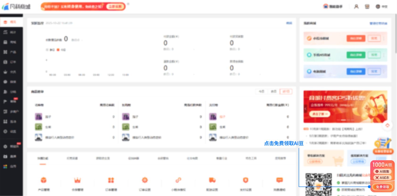商城至尊版、多商户直营版、多商户招商版、多商户至尊版的用户,登录商城管理后台后可免费领取AI豆: