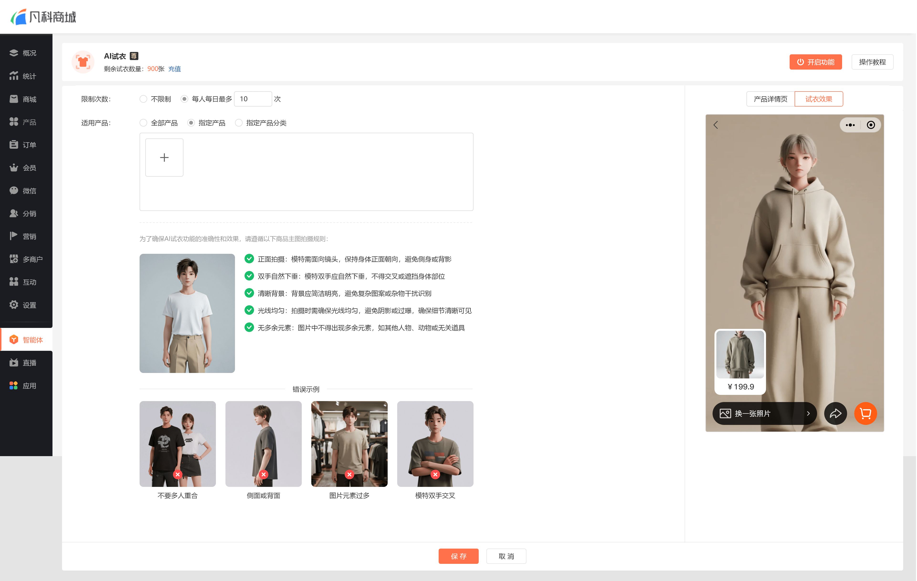 ① 前往商城后台【智能体-AI试衣】开启功能:
