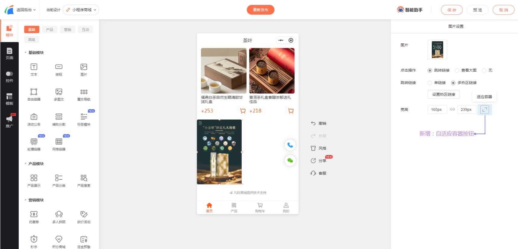 小程序设计器-自由容器/图片模块新增:自适应容器按钮,用户上传素材后,点击该按钮,图片会自动按照容器的最大宽/高自适应布局