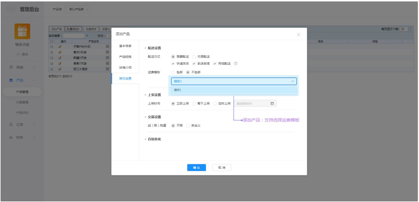 2. 模板创建完成,在添加商品时,可直接选择已创建的运费模板关联使用。