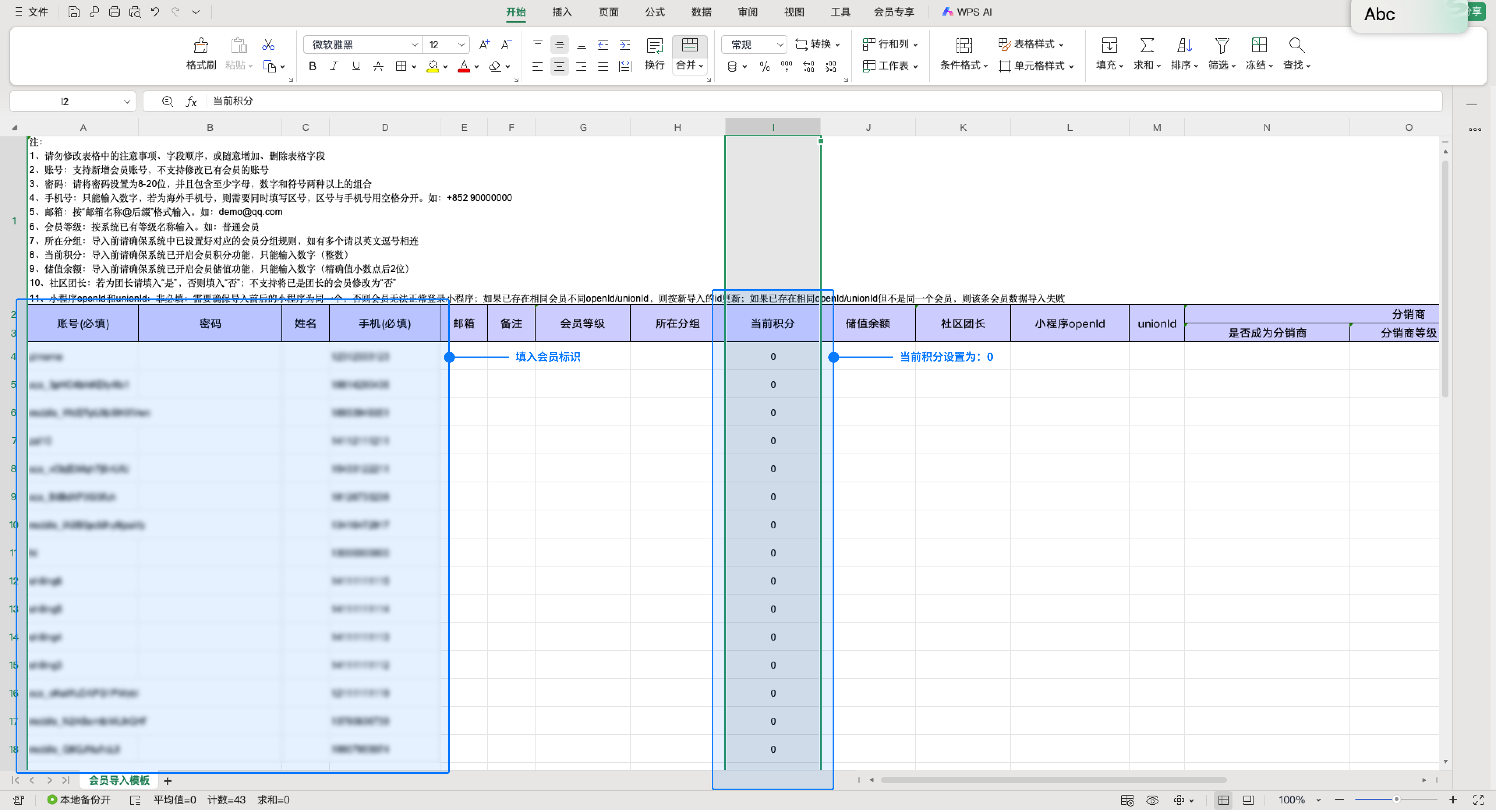 导出的表格中,可以直接查询各个会员的【当前积分】: