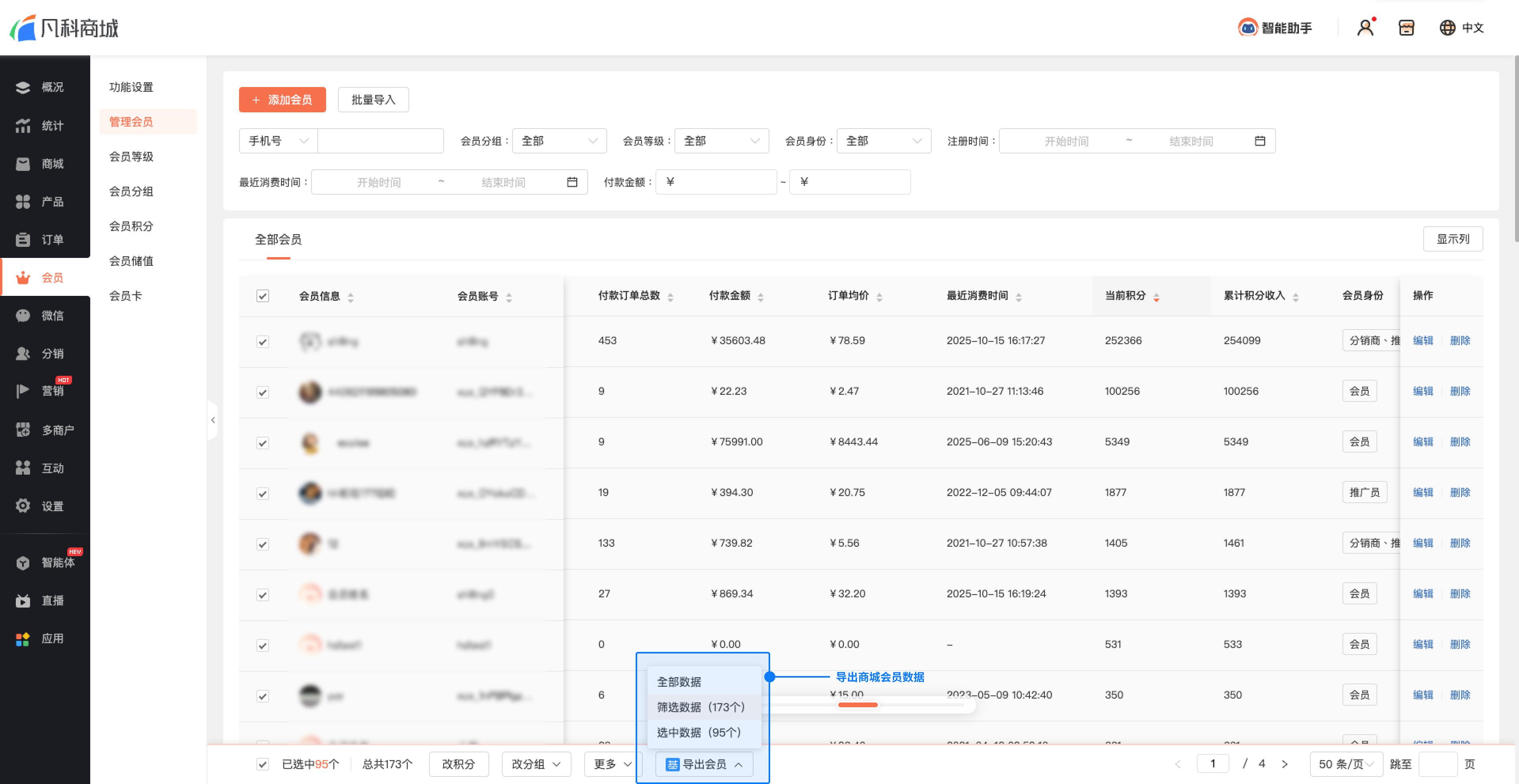 前往【商城后台-会员-管理会员】页,按条件筛选会员后点击底部的【导出会员】按钮:
