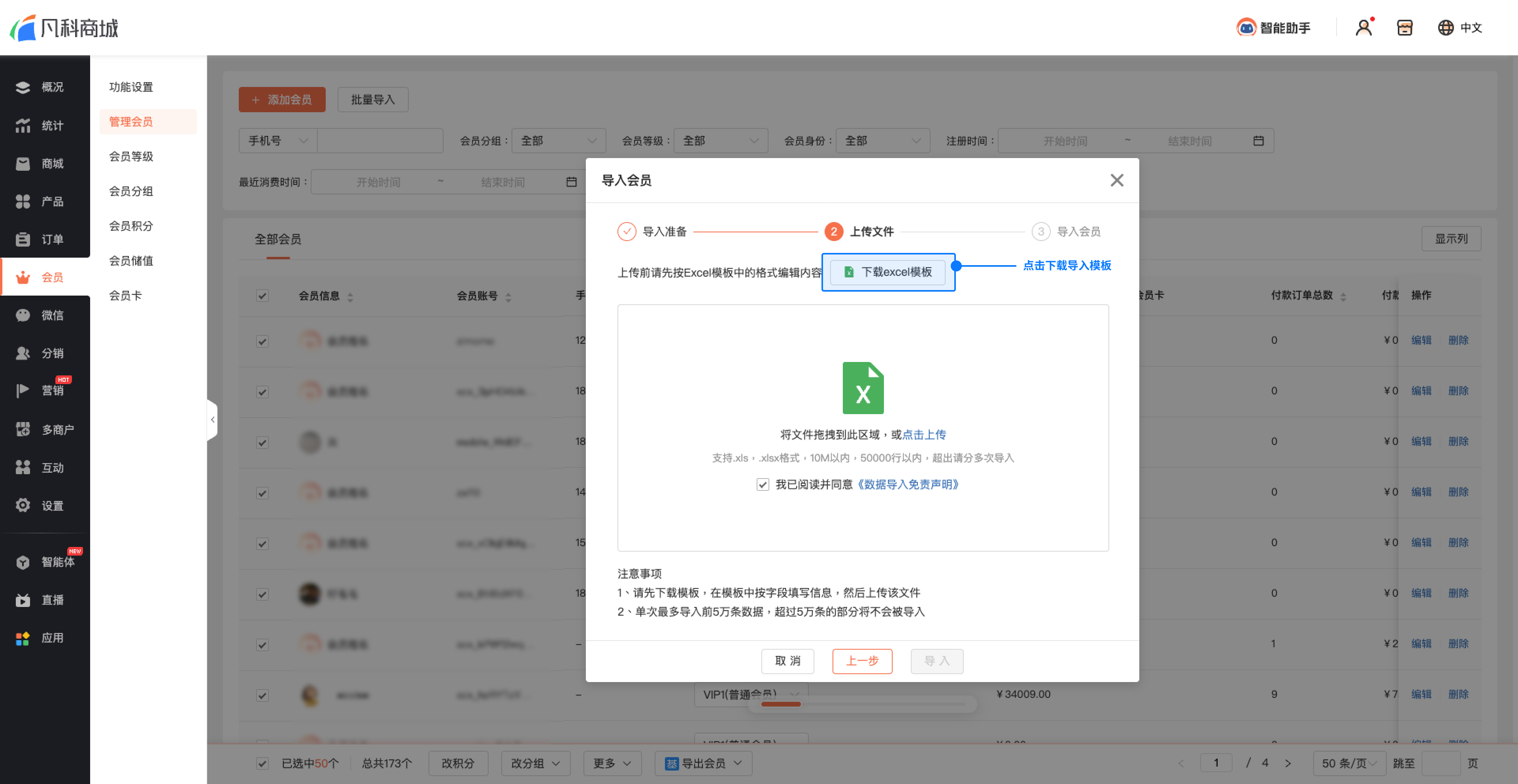 前往【商城后台-会员-管理会员】页,点击【批量导入】按钮,获取导入模板: