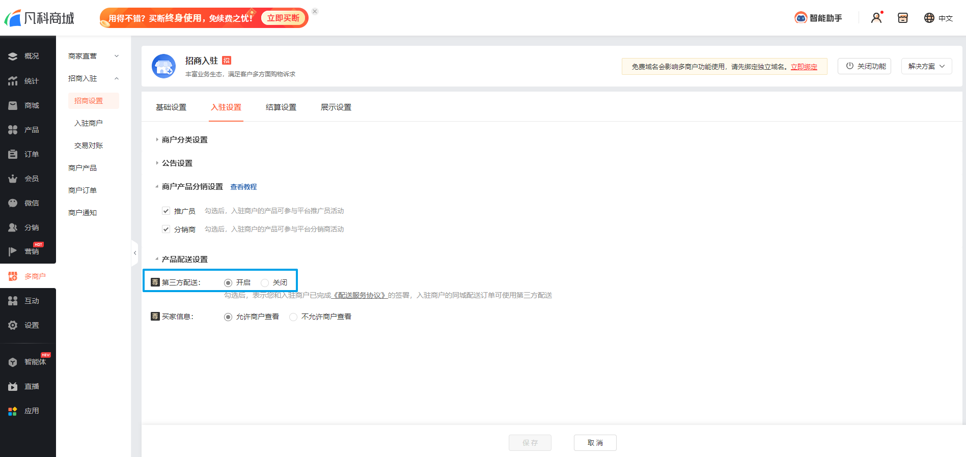 1. 商家前往商城后台【商城-多商户-招商入驻-招商设置-入驻设置】,开启入驻商户的第三方配送能力: