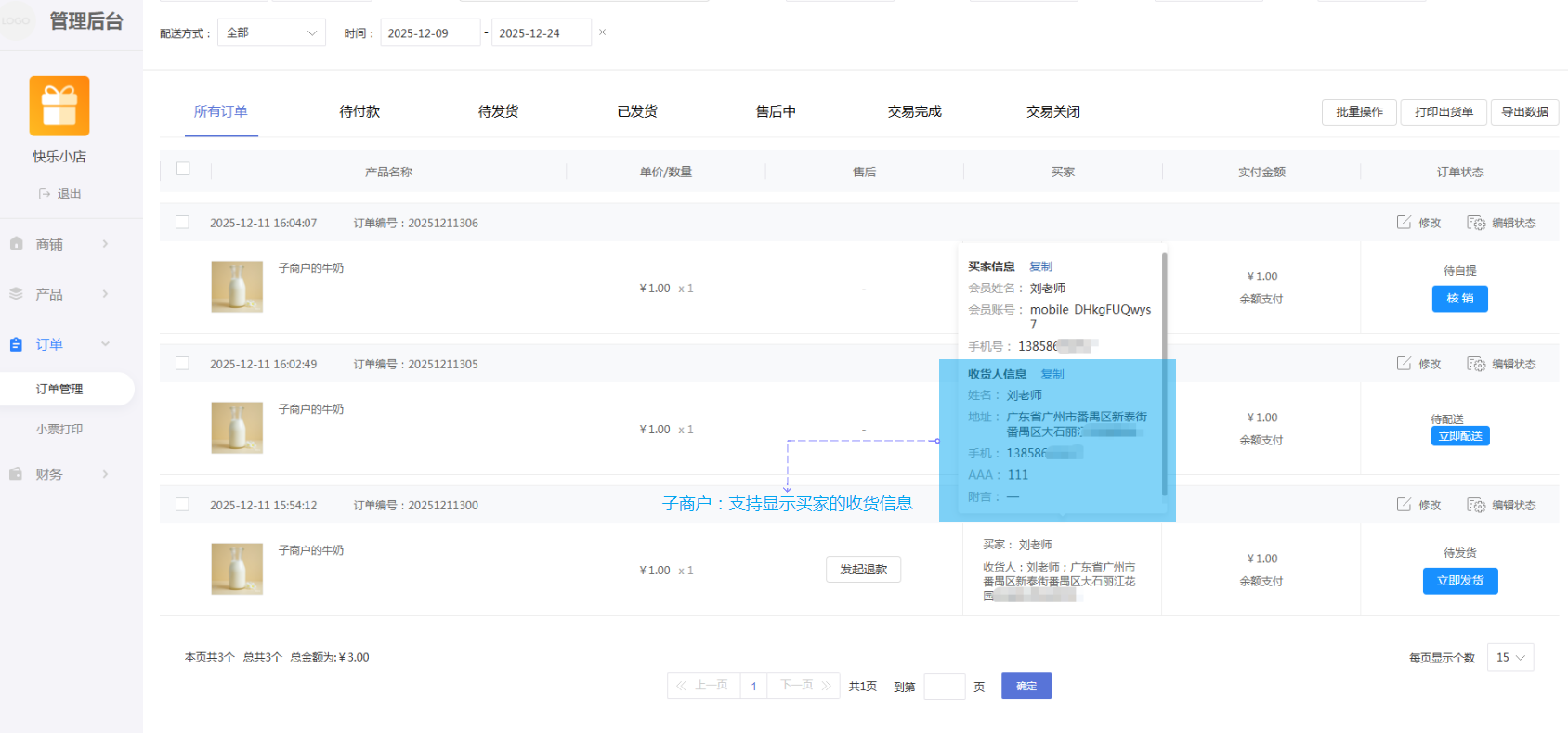 3. 客户提交订单后,商户可前往入驻商户后台【订单-订单管理】查看配送状态