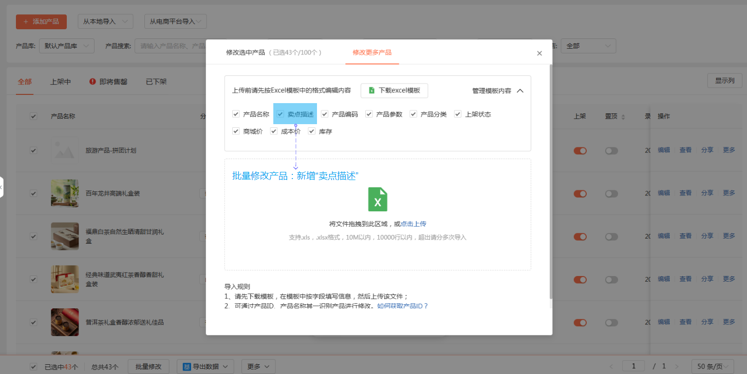 批量修改产品:新增“卖点描述”选项,勾选后,在excel里填写对应的卖点,导入后即可批量更新