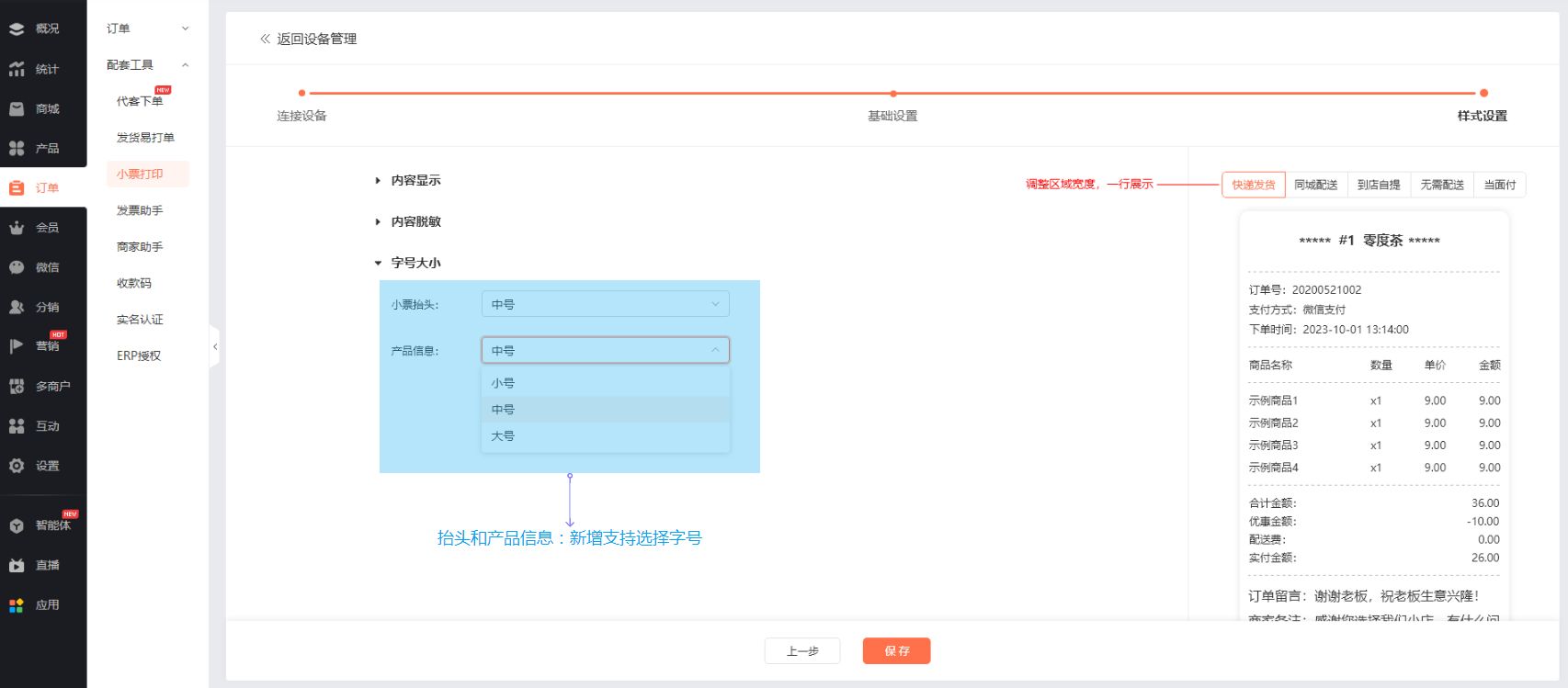 商家可根据打印纸的大小,自由选择【大】【中】【小】3个字号